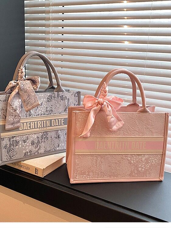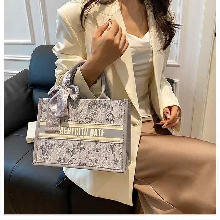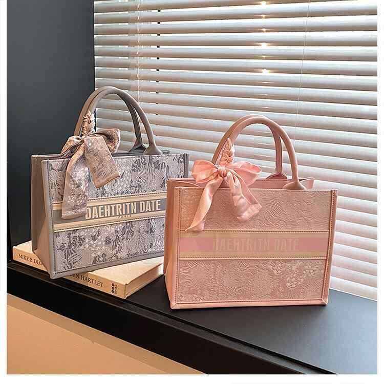 バッグ レディース 高級感 フレンチ風 刺繡 手提げ 鞄 大容量 トートバッグ 通勤 デイリーユース 普段使い PUレザー ややソフト 横型 スクエア ファスナー開閉 スマホポケット 内ポケット ステッチ グレー ピンク ダブルハンドル