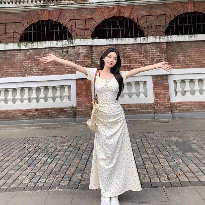 ワンピース レディース プラスサイズ 半袖 ロング丈 花柄 Aライン ウエストマーク 体型カバー 着痩せ クルーネック きれいめカジュアル ポリエステル ベージュ