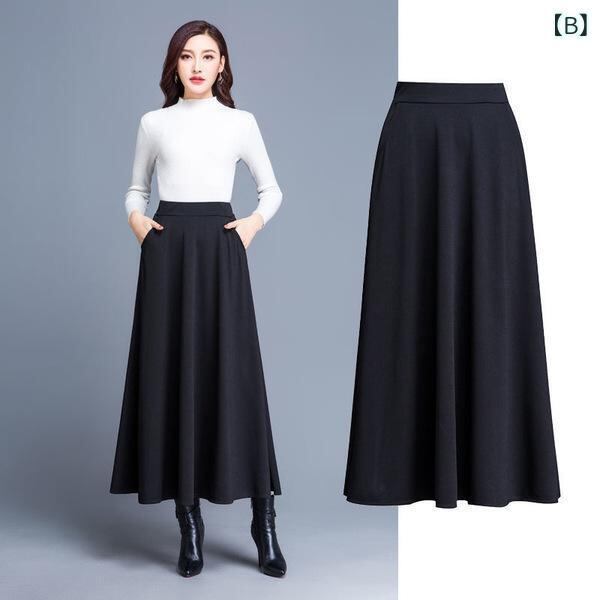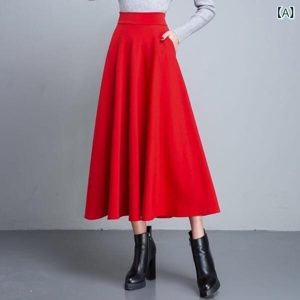 スカート レディース ハイウエスト ウエストゴム ミモレ丈 ロング丈 Aライン フレアスカート ポケット付き 無地 着痩せ 大きいサイズ ゆったり ポリエステル 快適 ストレッチ 普段使い 万能 レッド ブラック ボルドー