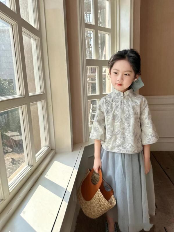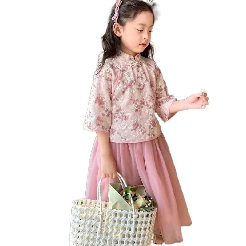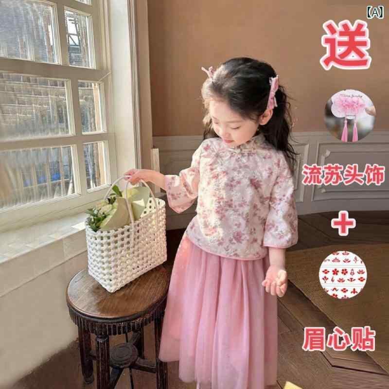 セットアップ キッズ 女の子 中国風 漢服 唐装 古典衣装 プリンセスドレス風 コスチューム 発表会 2点セット シフォン ポリエステル 再生繊維 夏用 ピンク グレー