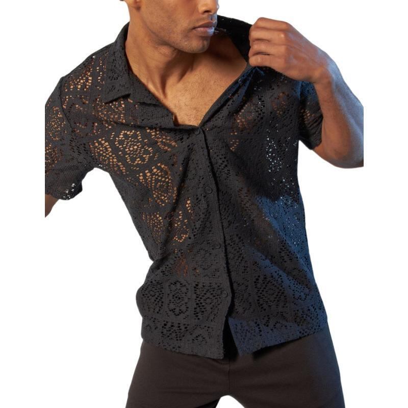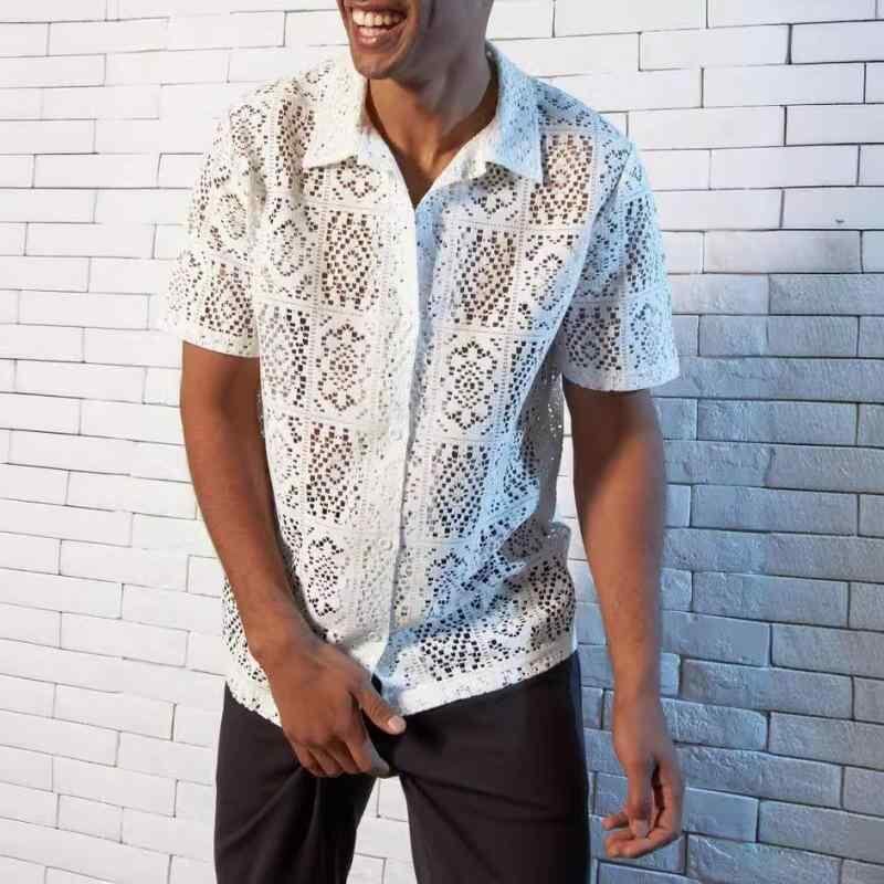 シャツ メンズ メッシュ 透かし編み 半袖 シースルー 開襟 カジュアル リゾート ビーチ ポリエステル 通気性 洗濯可能 防シワ 薄手 羽織り 大人カジュアル