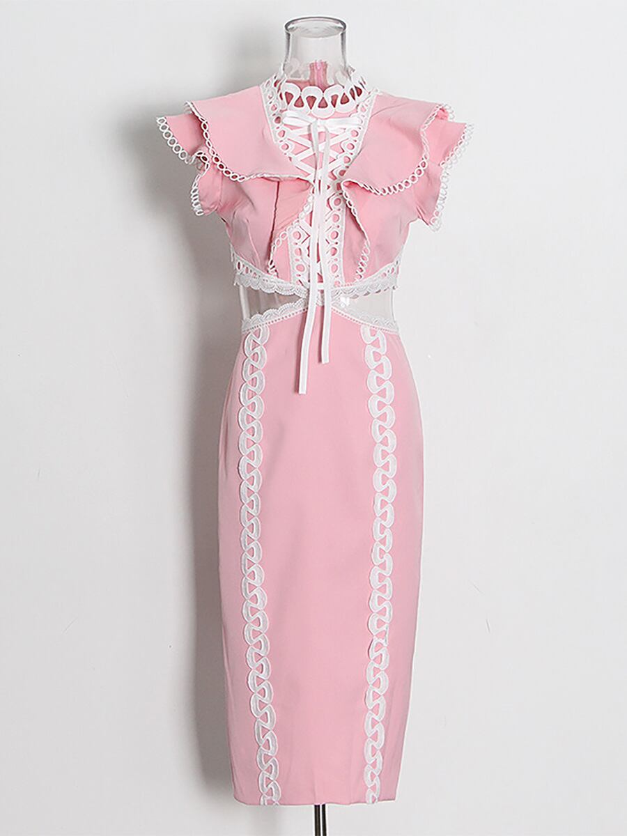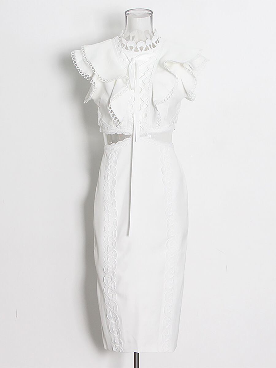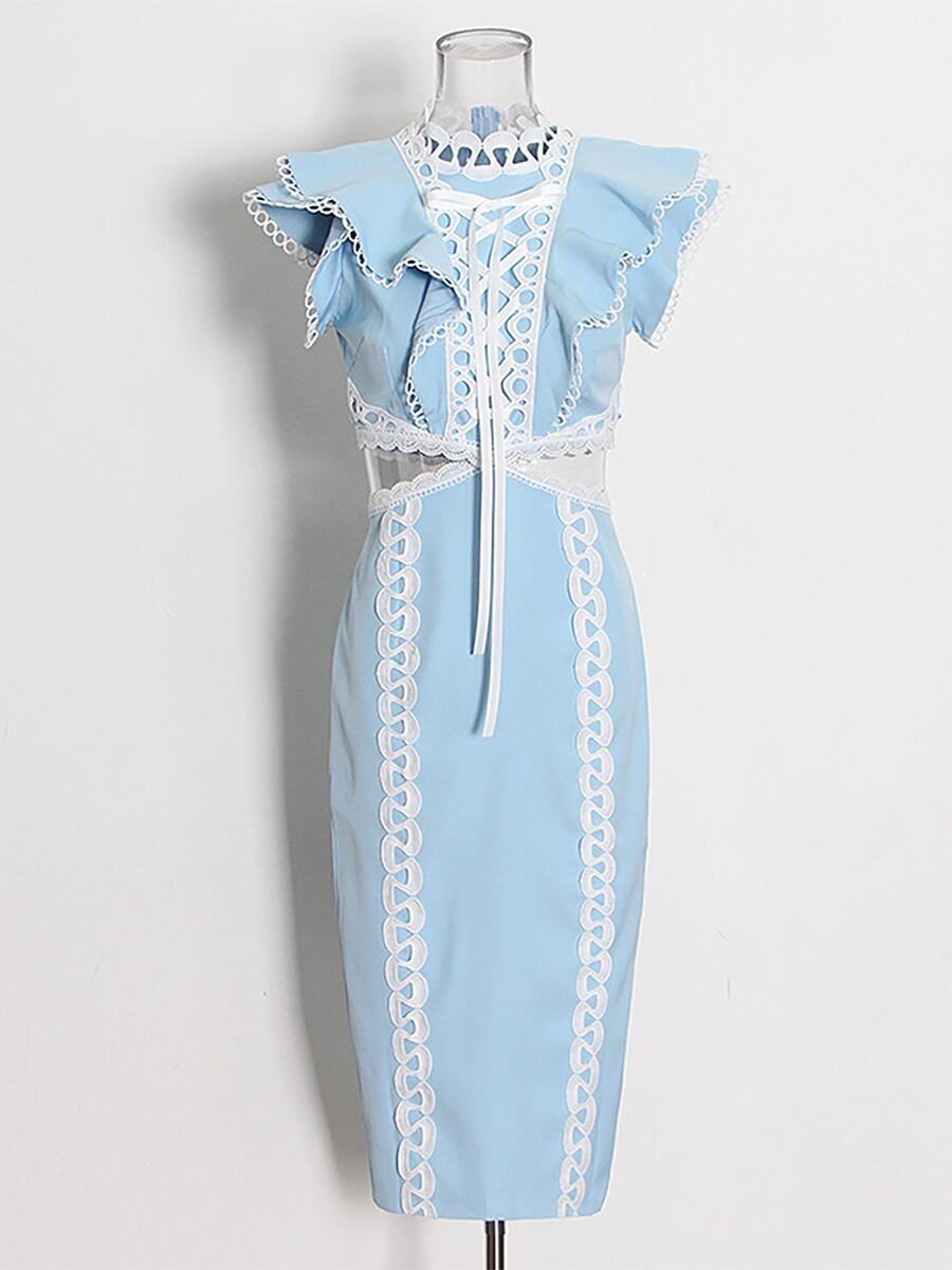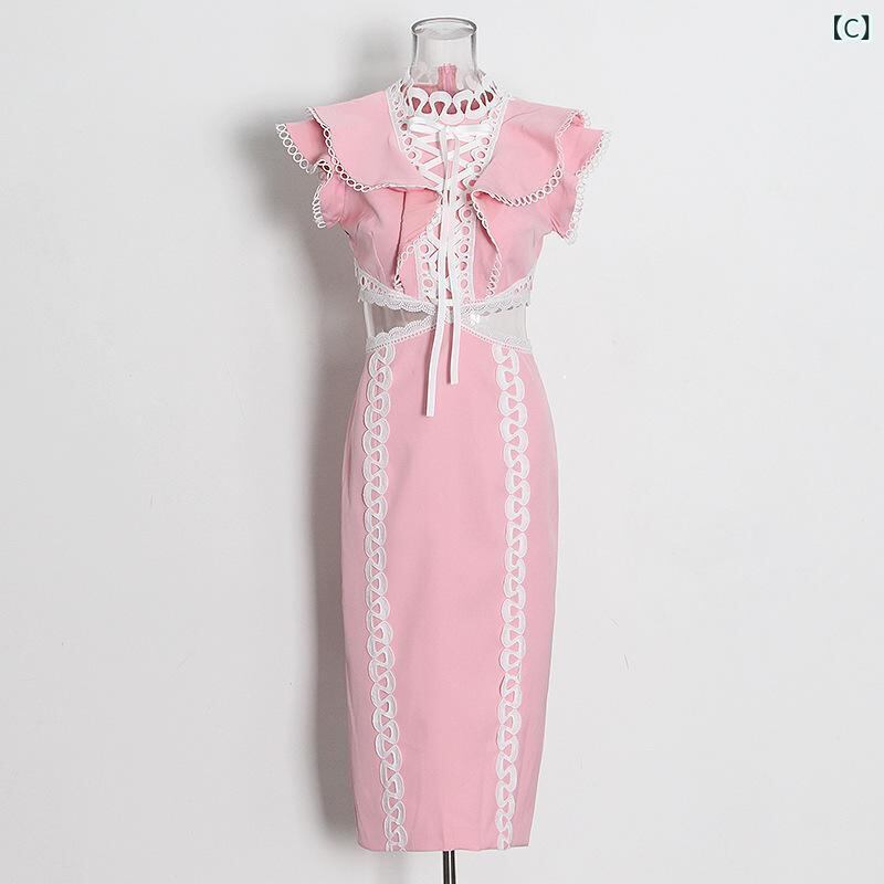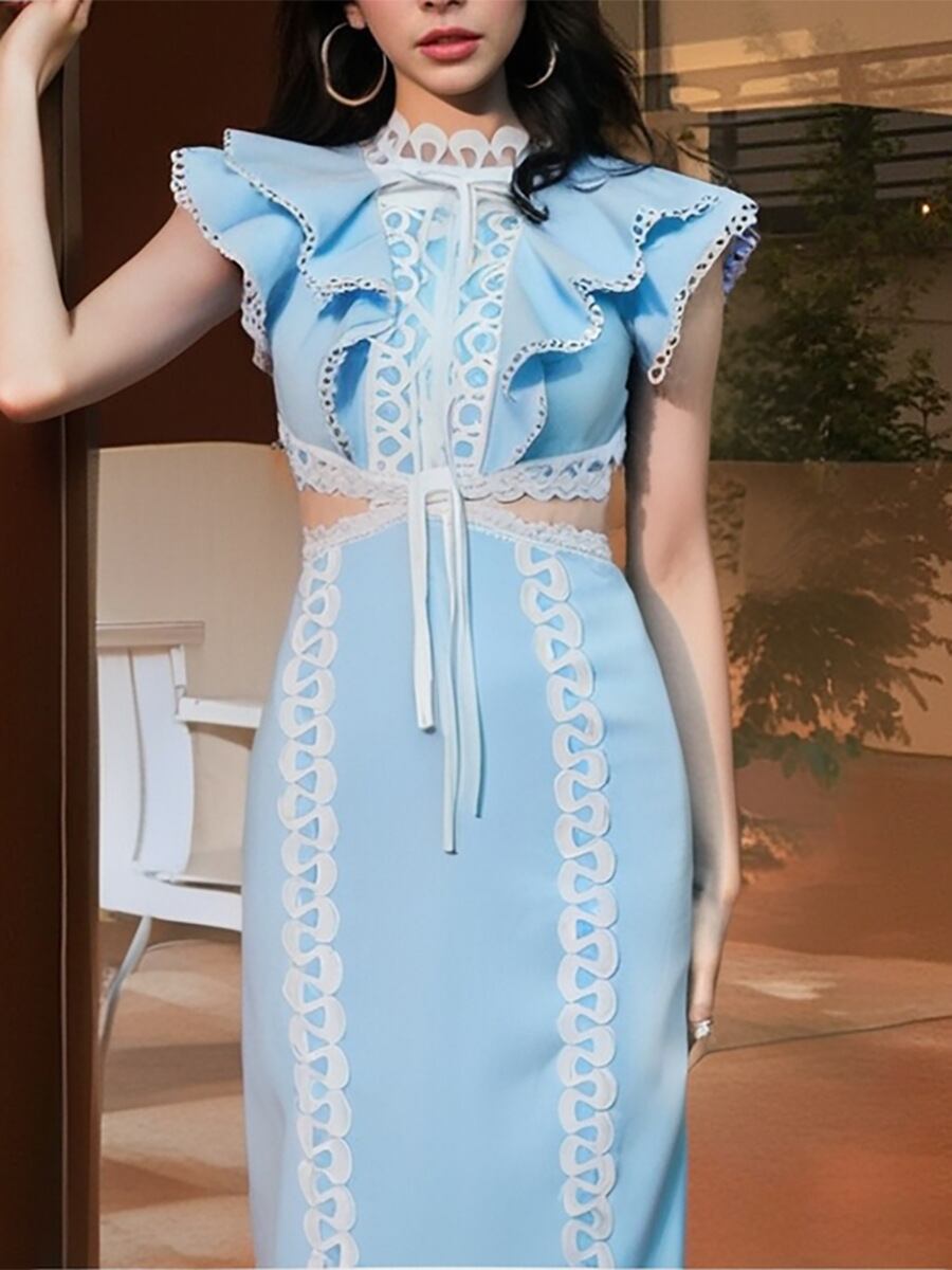 ワンピース レディース 上品 エレガント フレンチスタイル ロング丈 ノースリーブ ハイウエスト ウエストオープン レース切り替え スタイルアップ 細見え ポリエステル ポリウレタン 無地 ホワイト ブルー ピンク