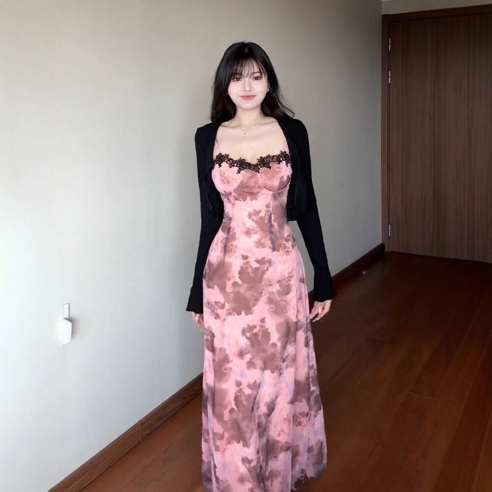 ワンピース レディース キャミソールワンピース ロング丈 タイダイ柄 レース切り替え セットアップ 薄手 カーディガン 羽織り ポリエステル 大人かわいい フェミニン 甘辛 ウエストマーク 体型カバー スタイルアップ 夏 お出かけ リゾート ピンク
