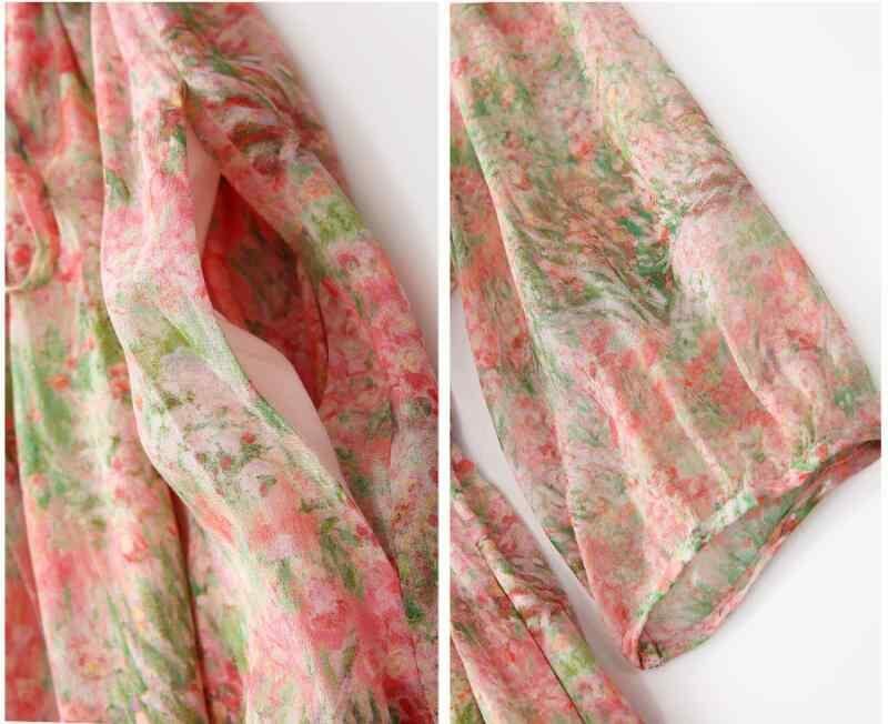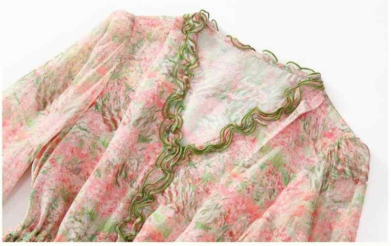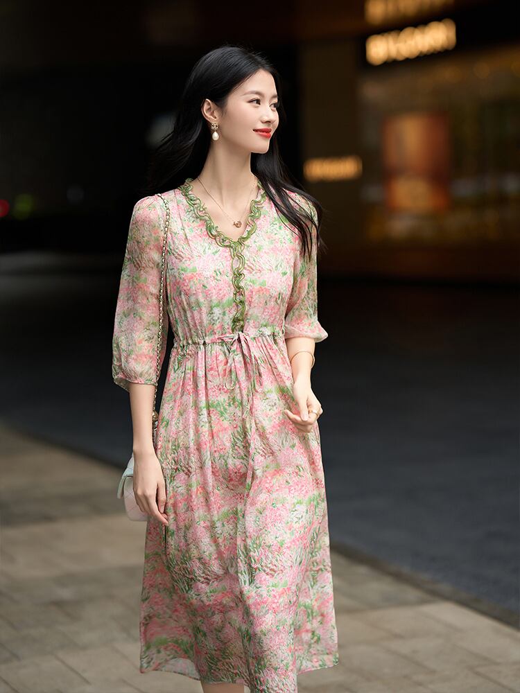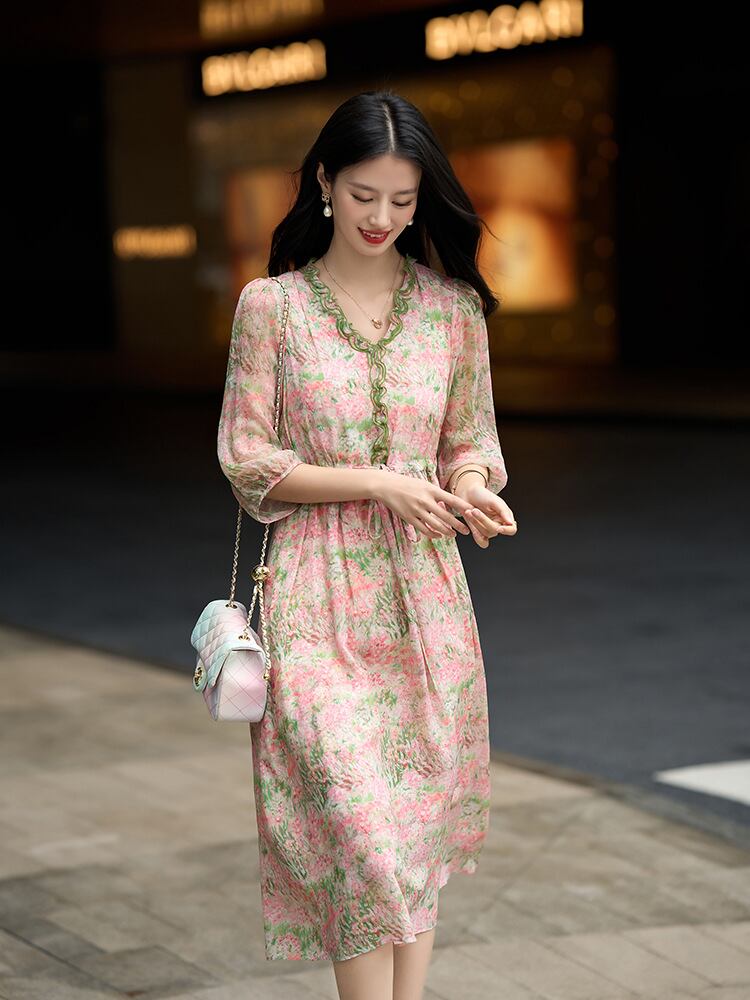 ワンピース レディース シルク Vネック フリル 五分袖 Aライン ミモレ丈 ベルト付き 花柄プリント 小花柄 ピンク系 エレガント フェミニン 高級感 きれいめ カジュアル リゾート お出かけ 普段使い