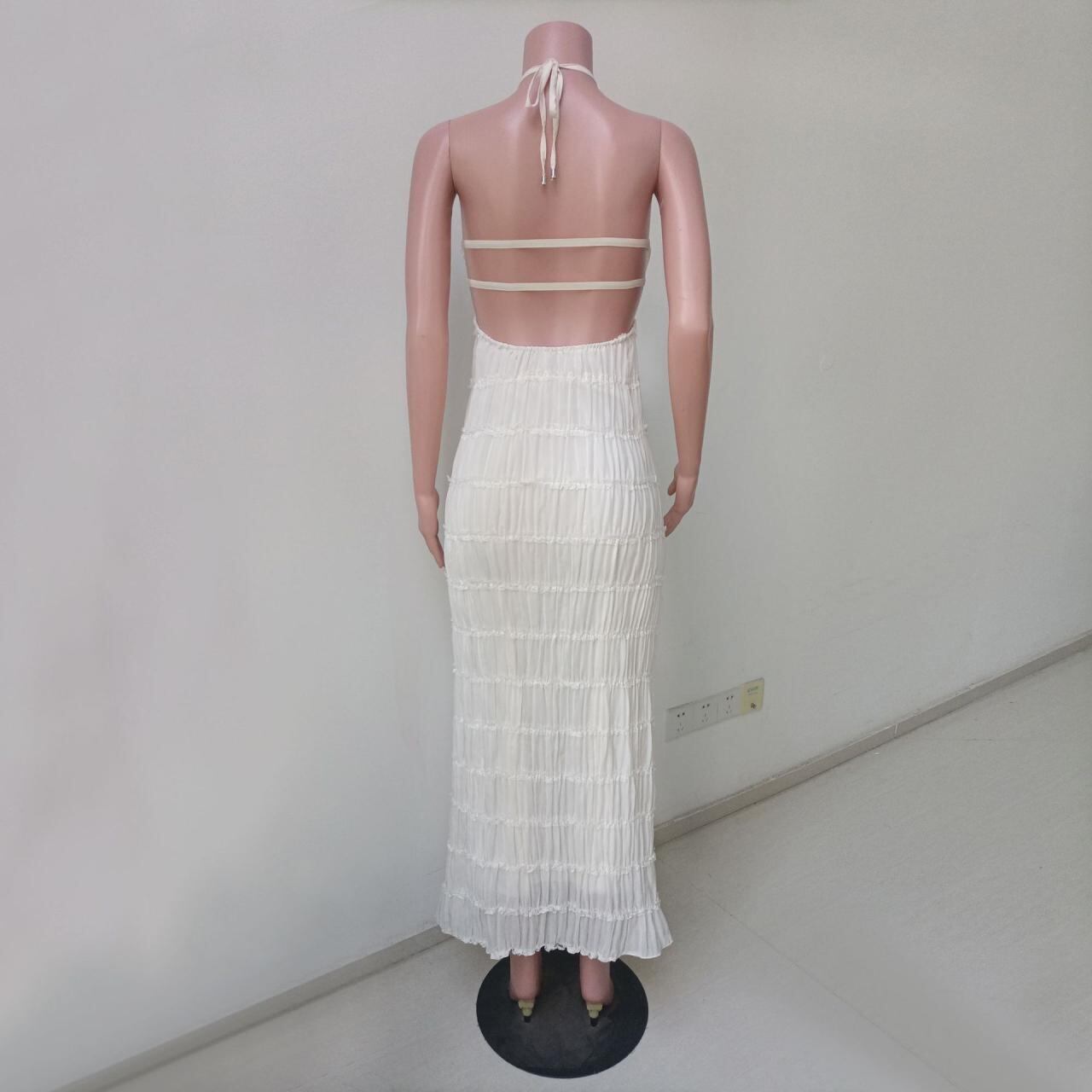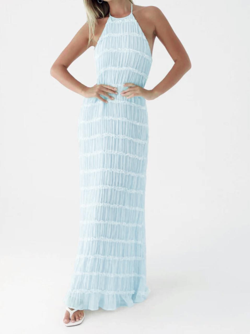 ワンピース レディース ホルターネック ストラップ フリル プリーツ ロング丈 リゾート Aライン ノースリーブ 無地 ポリエステル 上品 エレガント 高級感 裏地付き きれいめ セクシー 黒色 黄色