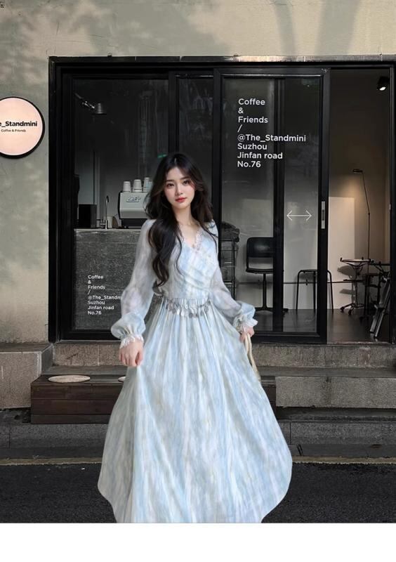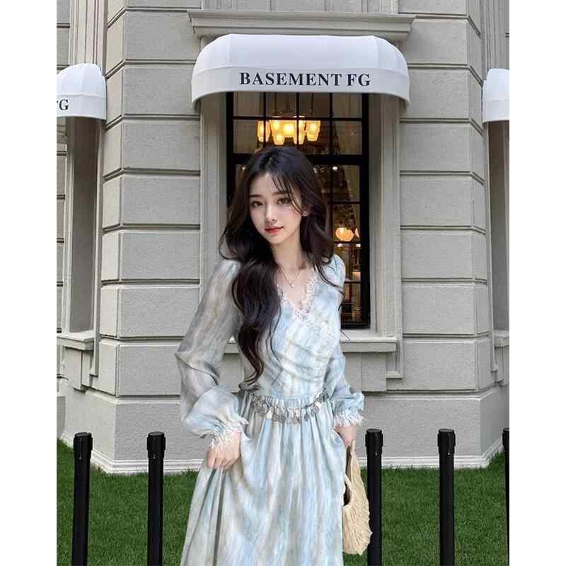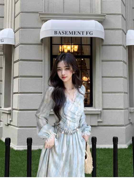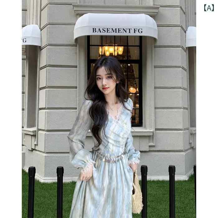・カテゴリ: ワンピース・スタイル: エレガント、通勤、フェアリー・主な素材: シフォン・素材混率: ポリエステル 30〜50%・柄: ペイント・デザイン: 切り替え、レース、絞り染め、ジッパー、プリント・シルエット: Aライン・スカート丈: ミディ丈・ネックライン: Vネック・袖のデザイン: ランタンスリーブ・袖丈: 長袖・ウエスト: ミドルウエスト・開閉: ジッパー・カラー展開: ブルー・サイズ展開: S、M、L、XL