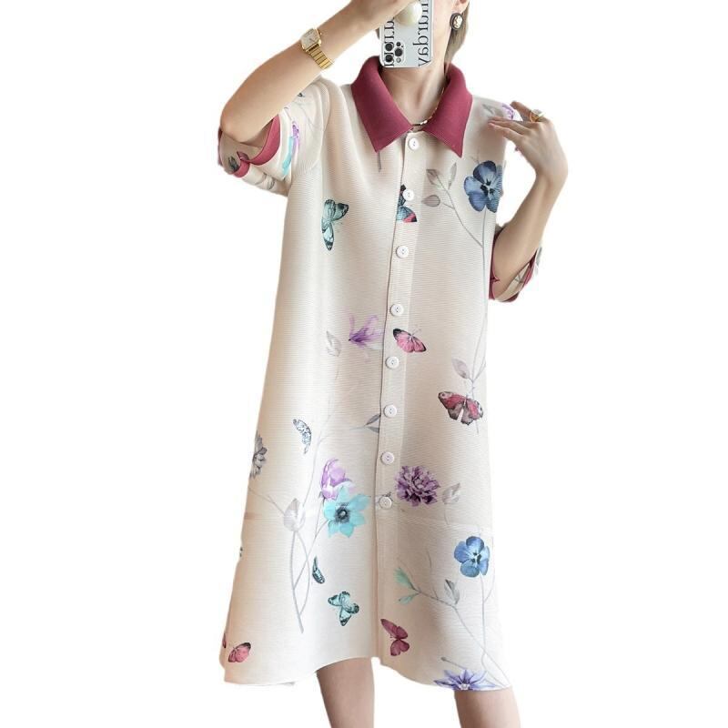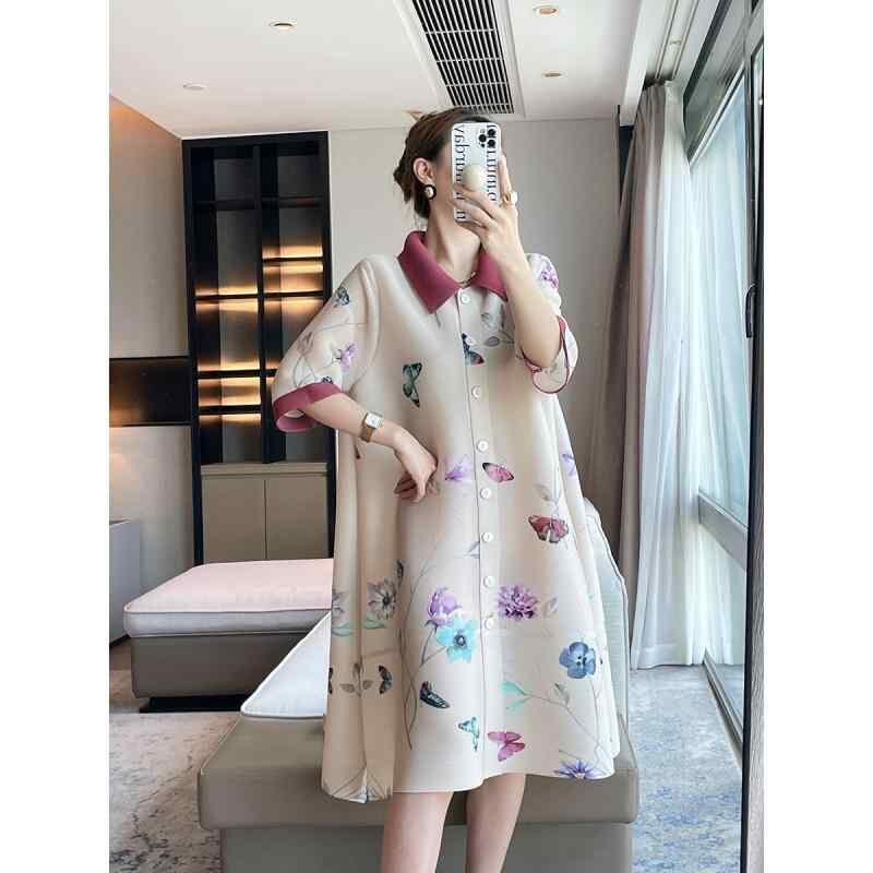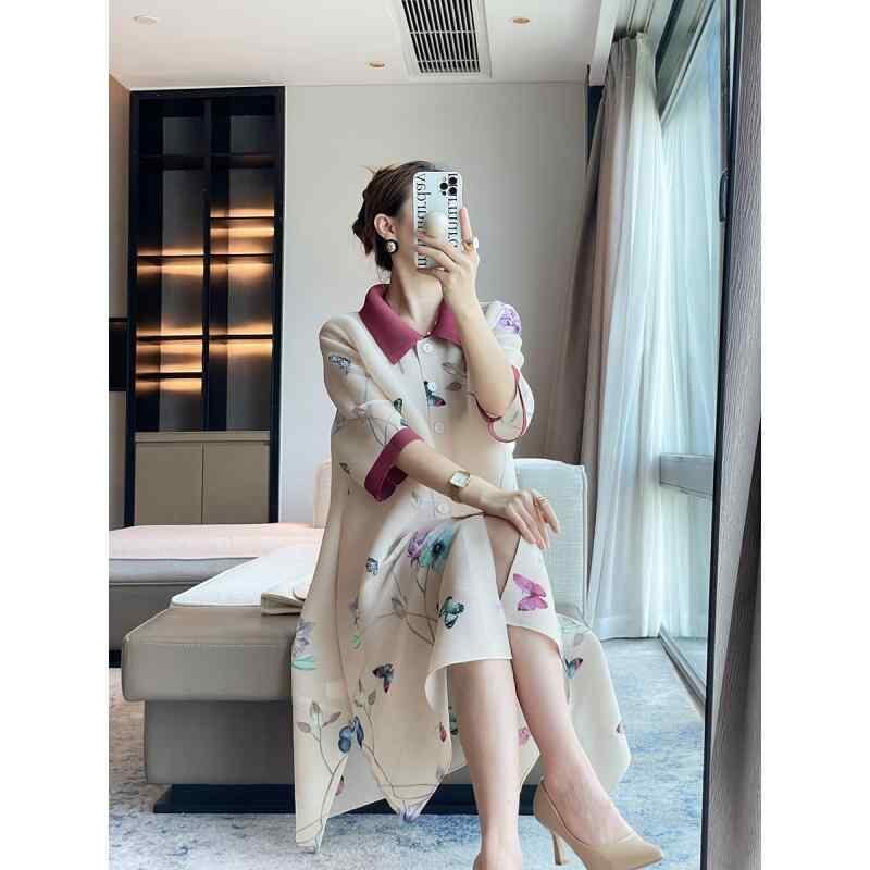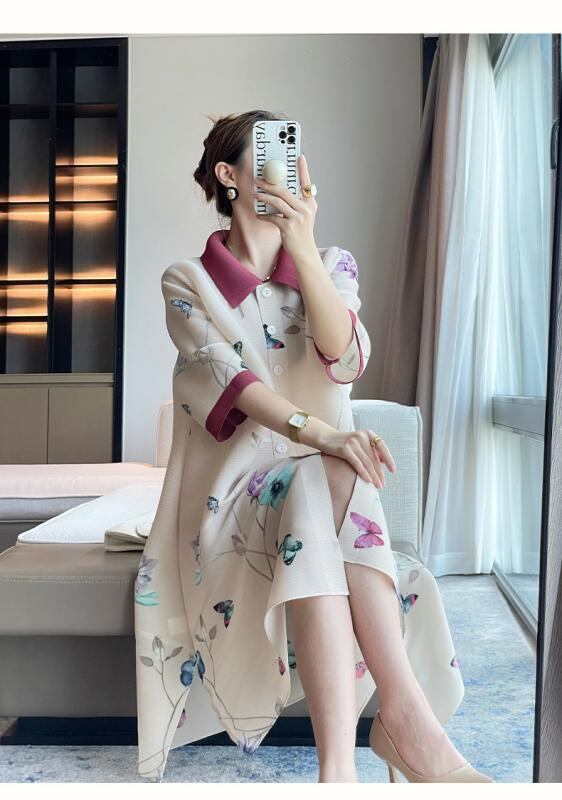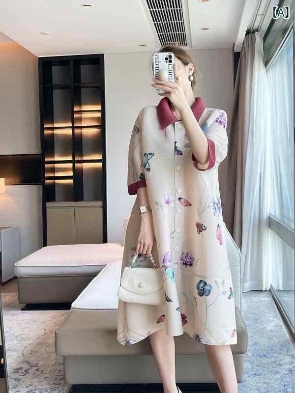 ワンピース チャイナ風 蝶柄 エレガント レトロ プリーツ ポリエステル 蝶プリント 襟付き 七分袖 ルーズフィット 体型カバー 着痩せ ミモレ丈 前ボタン 通勤 オフィス デイリーユース アプリコット