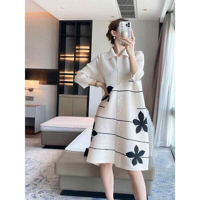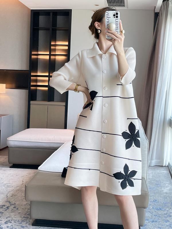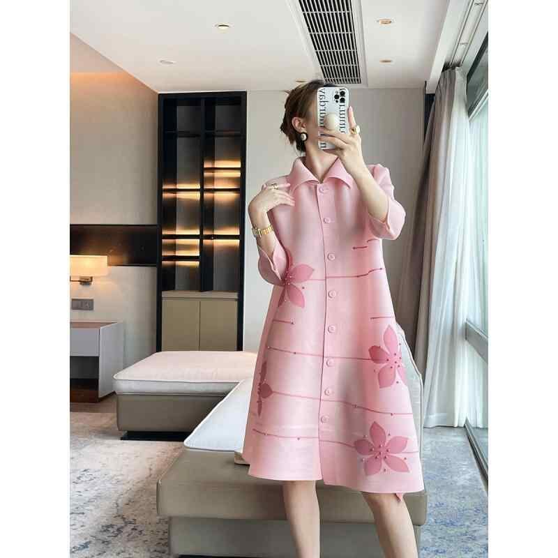 ワンピース レディース プリーツ カーディガン 襟付き バイカラー ビーズ装飾 エレガント 体型カバー 着痩せ効果 ミディ丈 長袖 ポリエステル 通勤 オフィス カジュアル ホワイト ピンク パープル