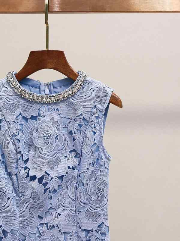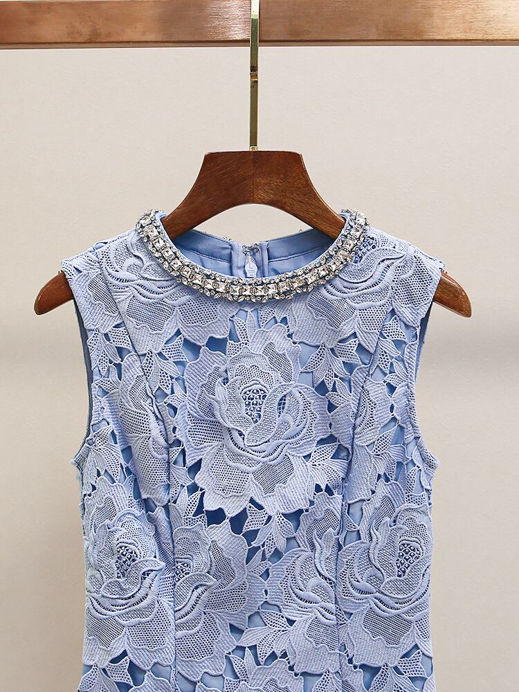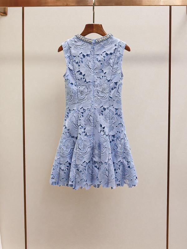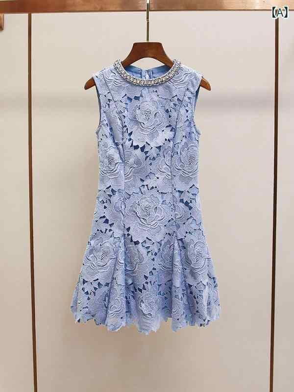 ワンピース レディース ラウンドネック ノースリーブ ミニ丈 レースフラワー ラインストーン 上質 フレンチスタイル エレガント 上品 通勤 ブルー