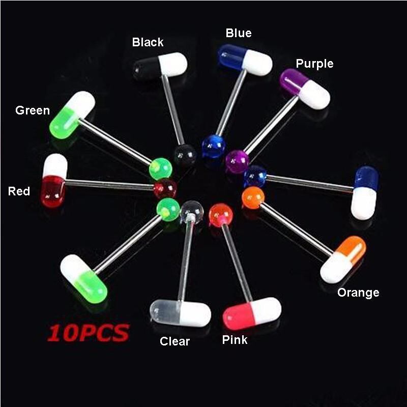 ボディピアス 男女兼用 アクリル 舌ピアス タンバーベル カプセル ピル 幾何学 オレンジ クリア パープル ブルー レッド グリーン ピンク ブラック 欧米スタイル ボディジュエリー