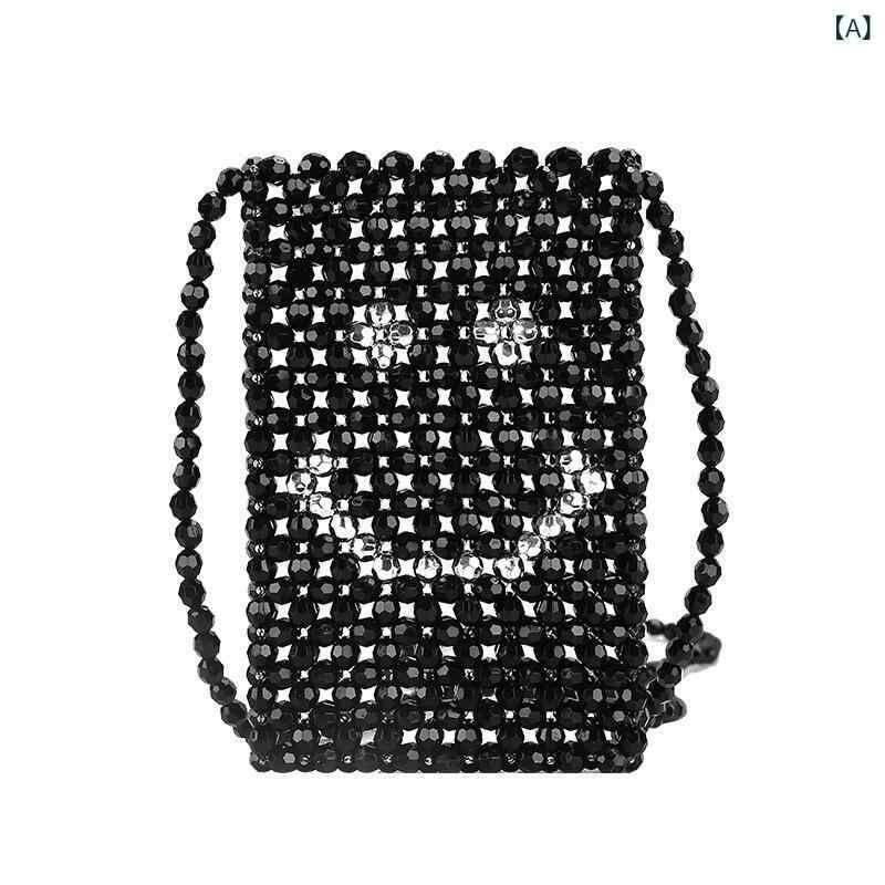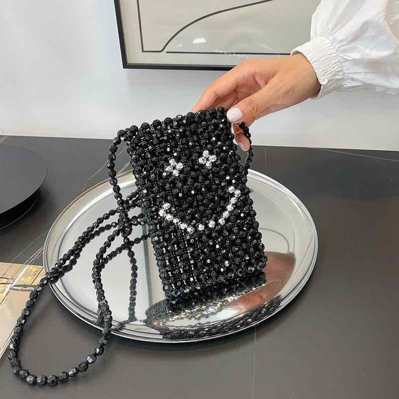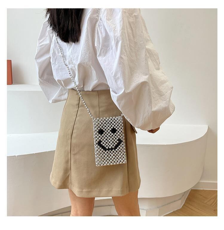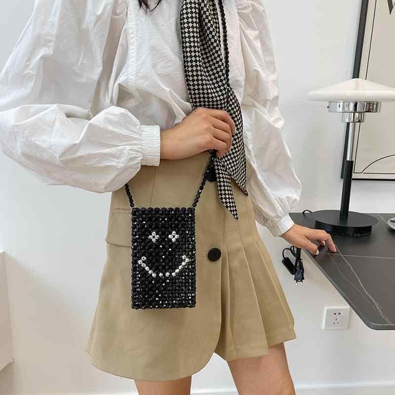 バッグ レディース トレンド パール スマイル 斜めがけ ミニ スマホポーチ ストロー 編み込み 縦型スクエア シンプル カジュアル 普段使い ブラック ホワイト