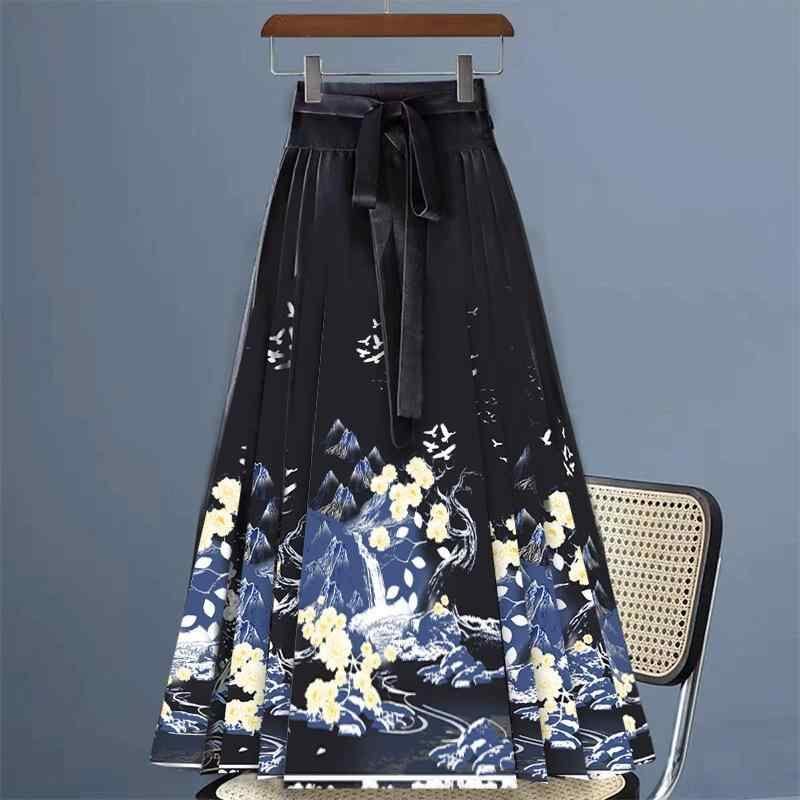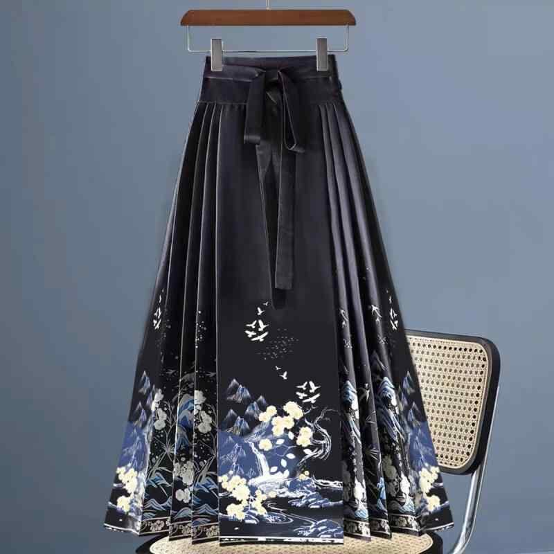 スカート レディース 漢服 馬面スカート プリーツ ロング丈 Aライン フレア ポリエステル シワになりにくい 幾何学模様 配色デザイン オールシーズン 明朝様式 ブラック