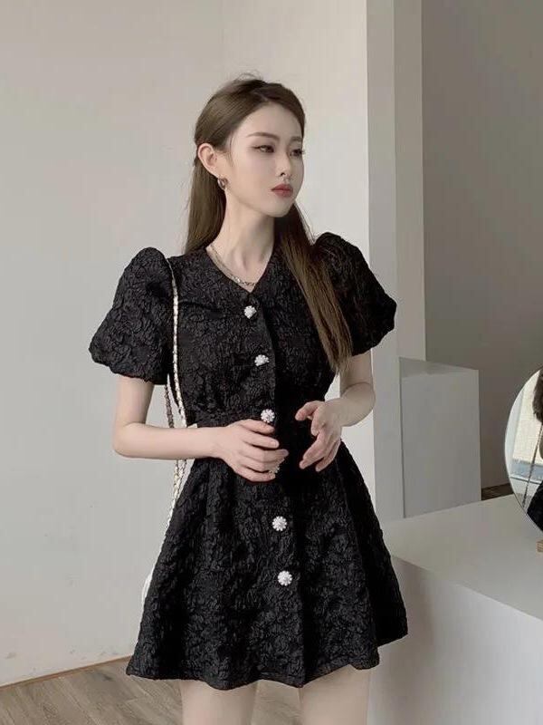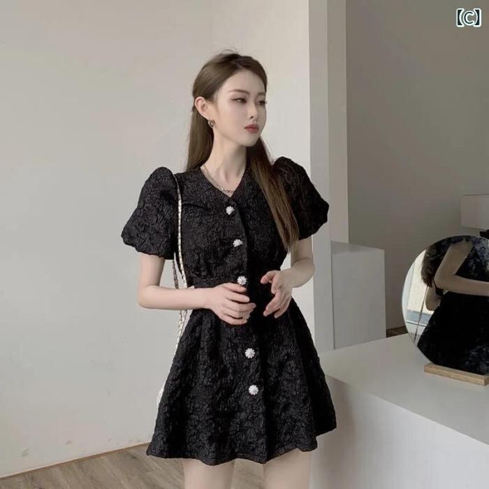 ワンピース レディース フレンチ風 立体エンボス パフスリーブ 背中開き フェミニンデザイン 小柄さん向け ミニ丈 ポリエステル素材 カジュアル 上品 エレガント