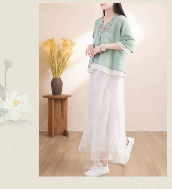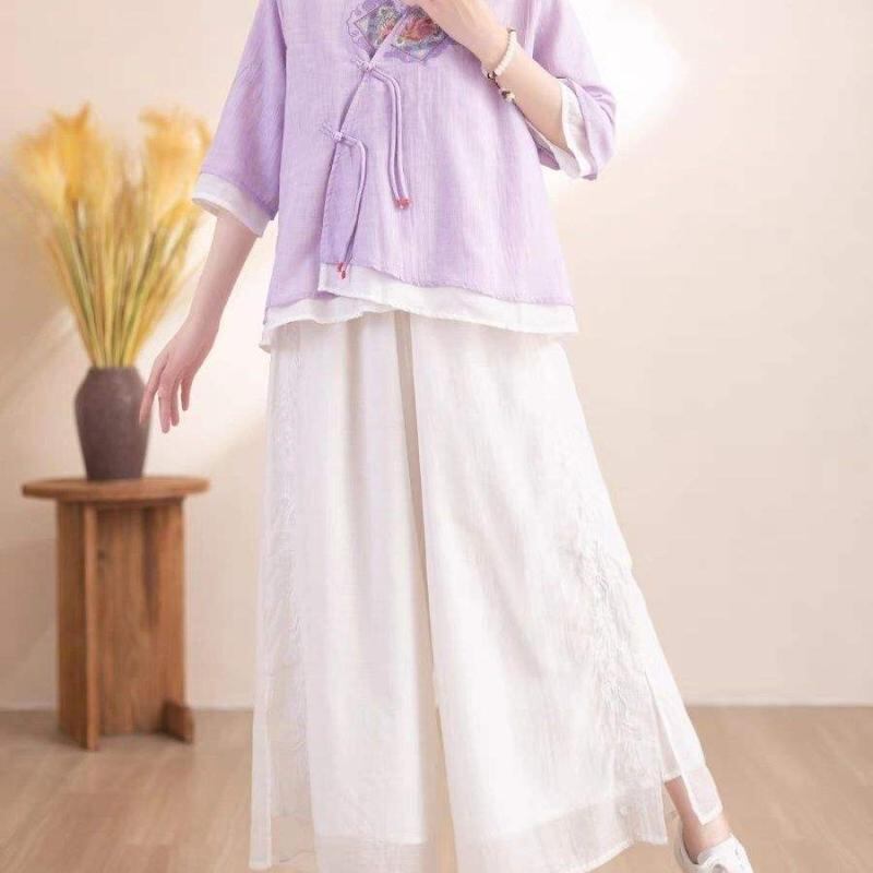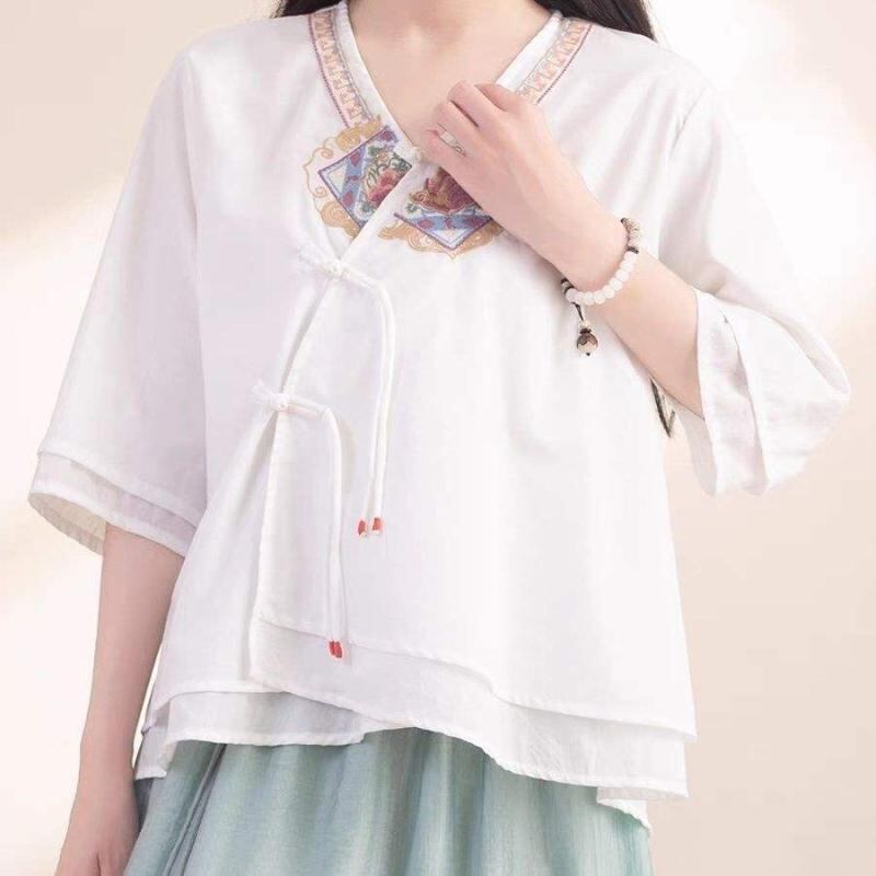 ブラウス レディース 夏物 Vネック 刺しゅう レトロ エスニック調 民族風 斜め合わせ チャイナボタン 綿麻 ゆったりシルエット