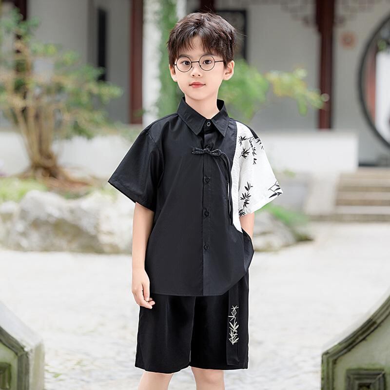 セットアップ 男の子 新チャイナ風 漢服 中国伝統衣装 半袖 切り替え シャツ ショートパンツ 上下セット 薄手 軽量 ポリエステル混紡 夏用 イベント 発表会 舞台 ステージ衣装