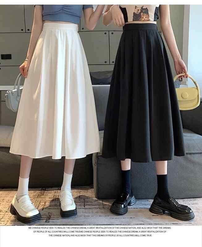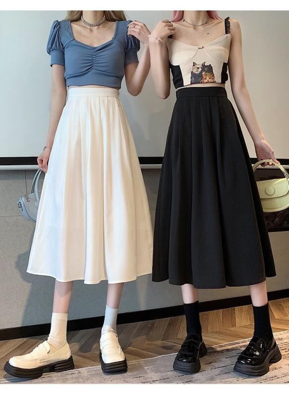 スカート レディース ハイウエスト Aライン プリーツ フレアスカート ミディ丈 細見え ドレープ感 無地 ホワイト きれいめ カジュアル オフィス