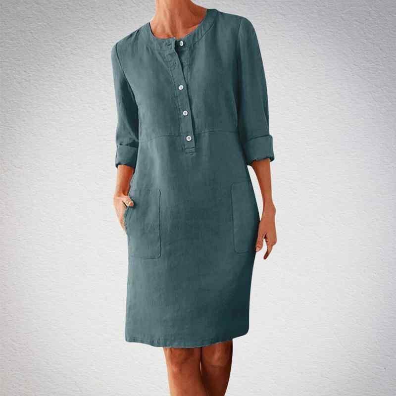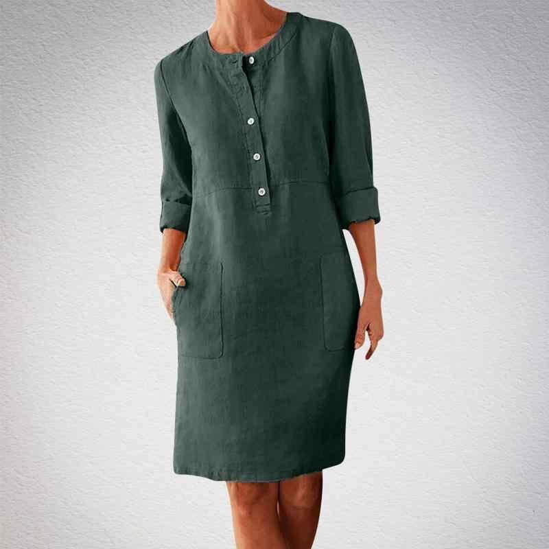 ワンピース レディース 大きいサイズ ゆったり 綿麻 コットンリネン ラウンドネック 長袖 ミディ丈 Aライン コクーンシルエット 切り替えデザイン 無地 きれいめ シンプル 通勤 オフィス カジュアル