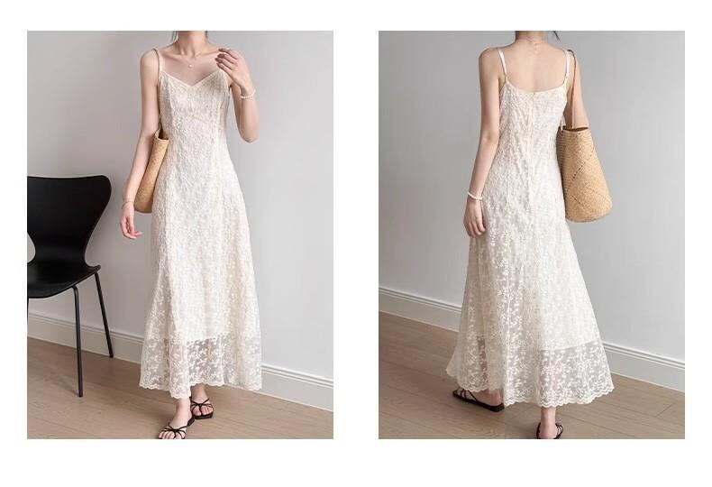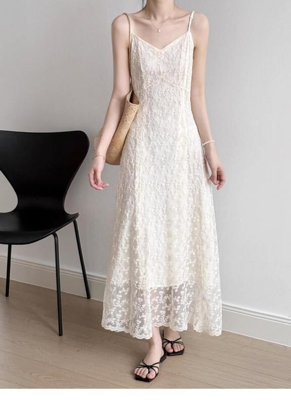 ワンピース レディース レース キャミソール ロング Aライン ウエストマーク 細見え フェミニン ドレープ 夏 Vネック ノースリーブ ハイウエスト ポリエステル アプリコット