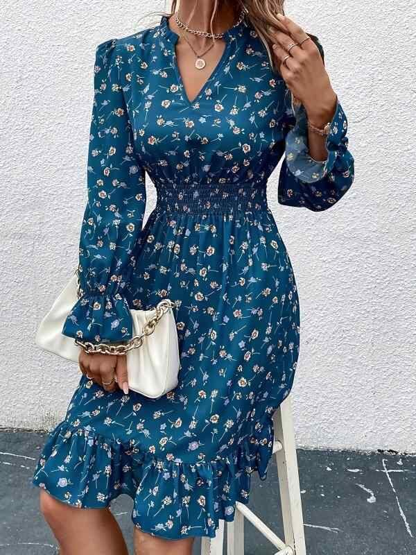 ・カテゴリ: 连衣裙・スタイル: エレガント、通勤スタイル・主な素材: ポリエステル95%以上・柄: プリント・スカート丈: ミディ丈・スカートタイプ: ヘムフリル、フレアスカート・ネックライン: Vネック・袖タイプ: ベルスリーブ・袖丈: 長袖・カラー展開: マルチカラー・サイズ展開: S、M、L、XL