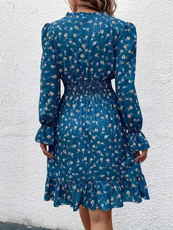 ワンピース レディース Vネック 長袖 花柄 フレアスリーブ フリル フレアスカート エレガント 上品 通勤 オフィス ポリエステル