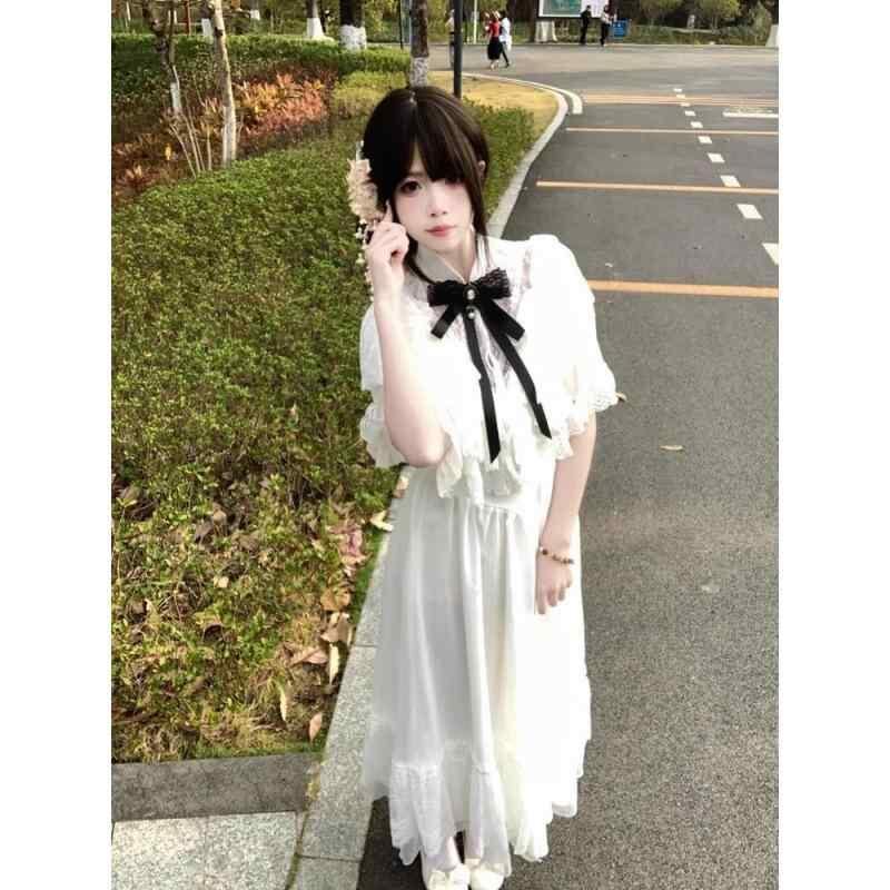 ワンピース レディース ロリータ プリンセス風 夏 半袖 スクエアネック パフスリーブ 白 ホワイト 無地 ティータイム フレンチガーリー ヴィンテージ風 ポリエステル ミディ丈 Aライン リボン付き