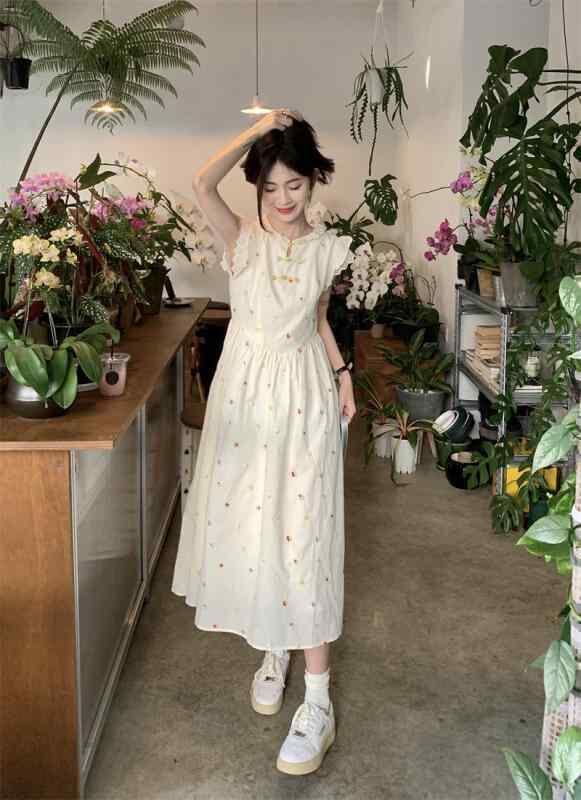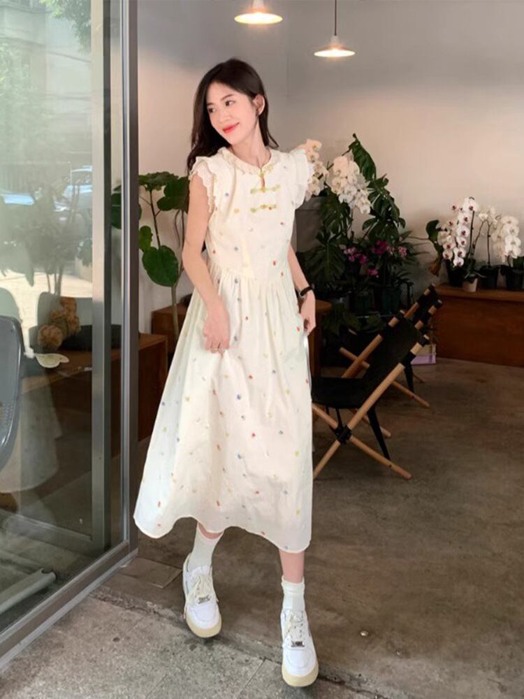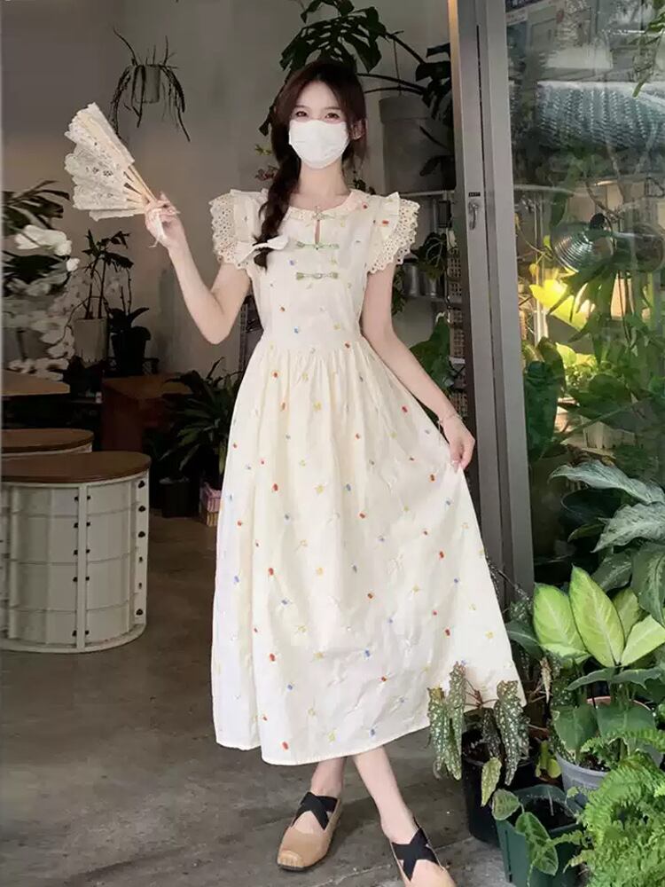 ワンピース レディース 新チャイナ風 半袖 小花柄 ロング丈 Aライン ハイウエスト ウエストマーク 細見え 高級感 フェミニン 上品 ラウンドネック フリル袖 アプリコット ポリエステル 夏 お出かけ 普段使い