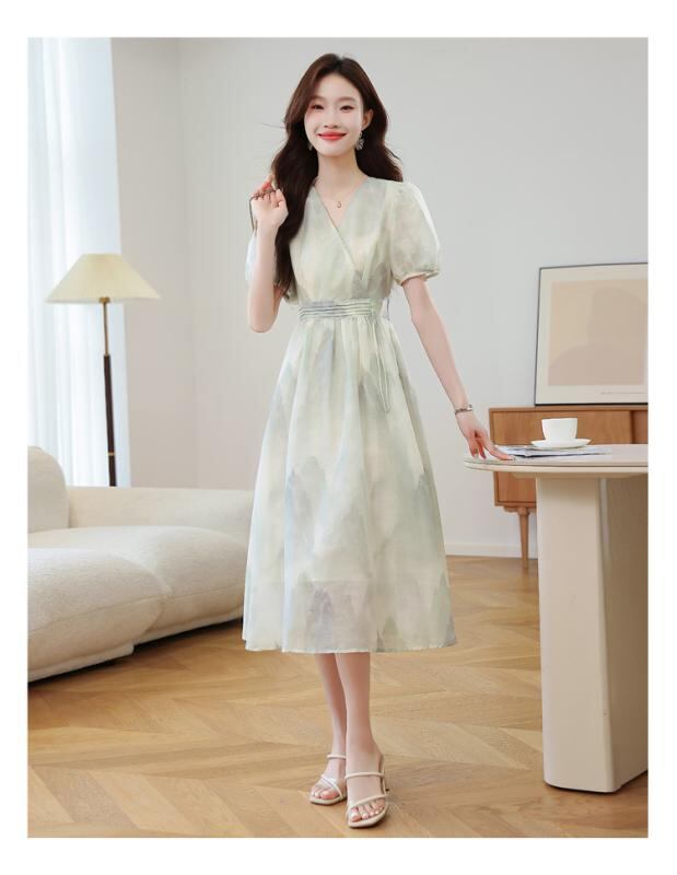 ワンピース レディース 小花柄 新チャイナ風 ミモレ丈 半袖 Vネック Aライン ハイウエスト 体型カバー ポリエステル プリーツ 上品 エレガント きれいめ 通勤 オフィス
