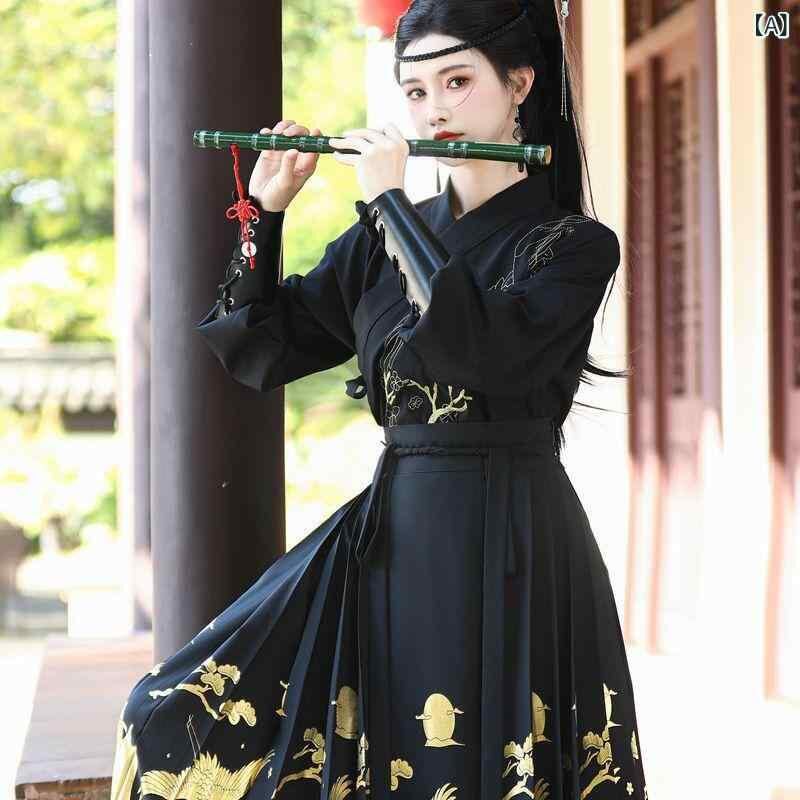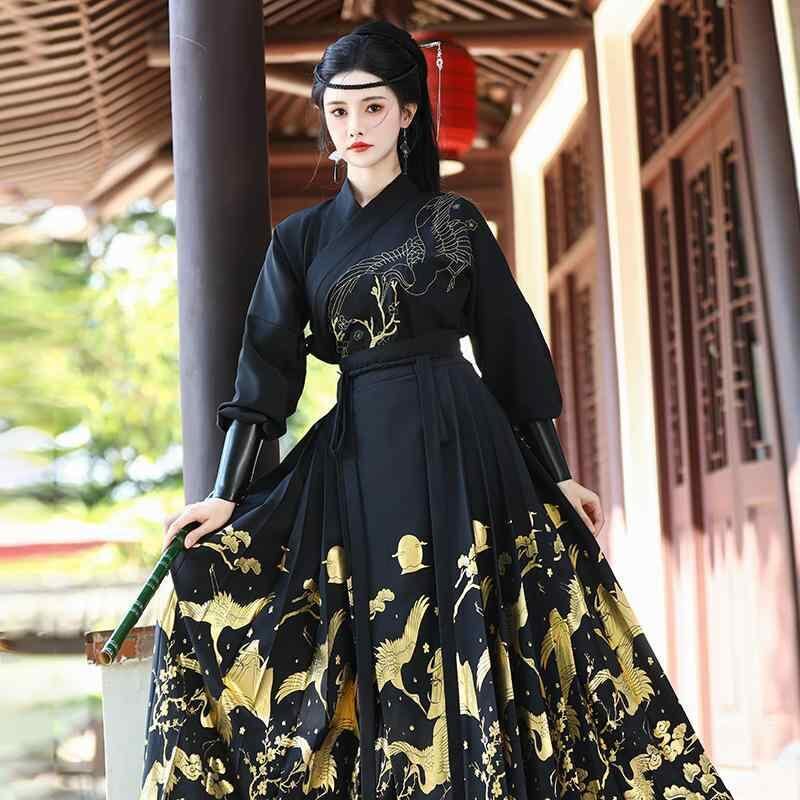 馬面スカート 女性用 大きいサイズ 漢服 セットアップ エレガント 黒 中華風 箔押し加工 レトロ的な 中国伝統衣装