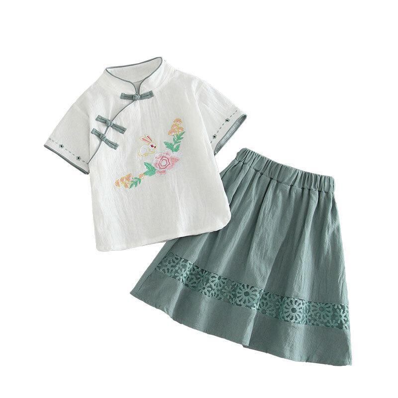 ワンピース 子供 女の子 ベビー 旗袍 唐装 漢服 セット 綿麻 花柄 ウサギ柄 キャラクター 中国風 中華風 民族衣装 夏 柔らかい 肌触り グリーン ピンク