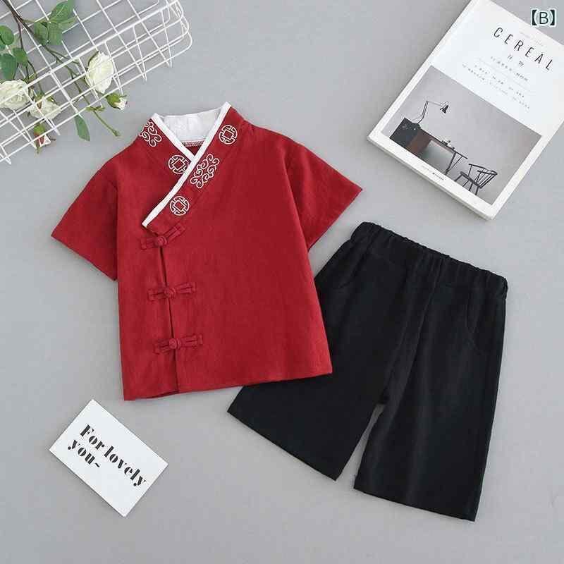 唐装 キッズ 男の子 女の子 子供服 夏物 夏服 薄手 軽量 半袖 ショートスリーブ 上下セット ツーピース 綿麻素材 コットンリネン 中華風 中国風 民族衣装 エスニック カジュアル 普段使い 発表会 舞台衣装 イベント ダンス 着心地快適