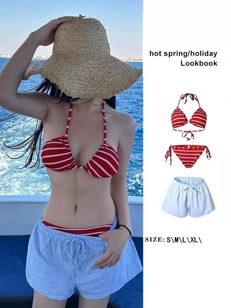 水着 レディース ビキニ スリーピース チューブトップ ホルターネック セクシー リゾート 温泉 海水浴 プール カップ付き ワイヤーなし ポリエステル スパンデックス ストライプ ブラ ショーツ ショートパンツ レッド ブラック