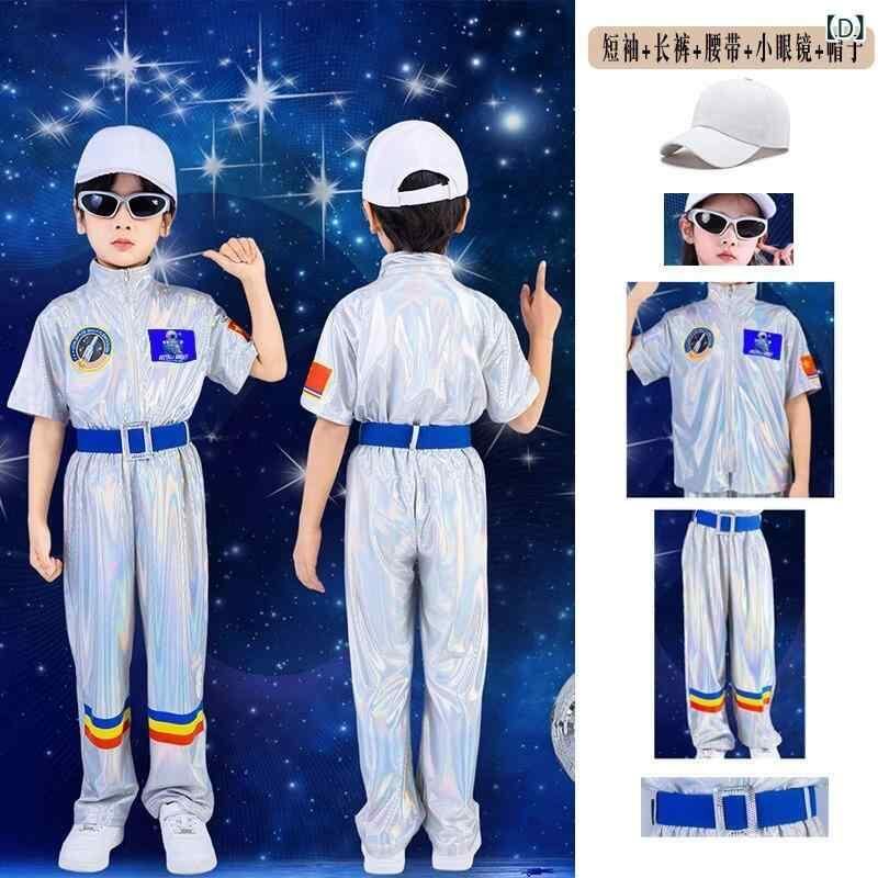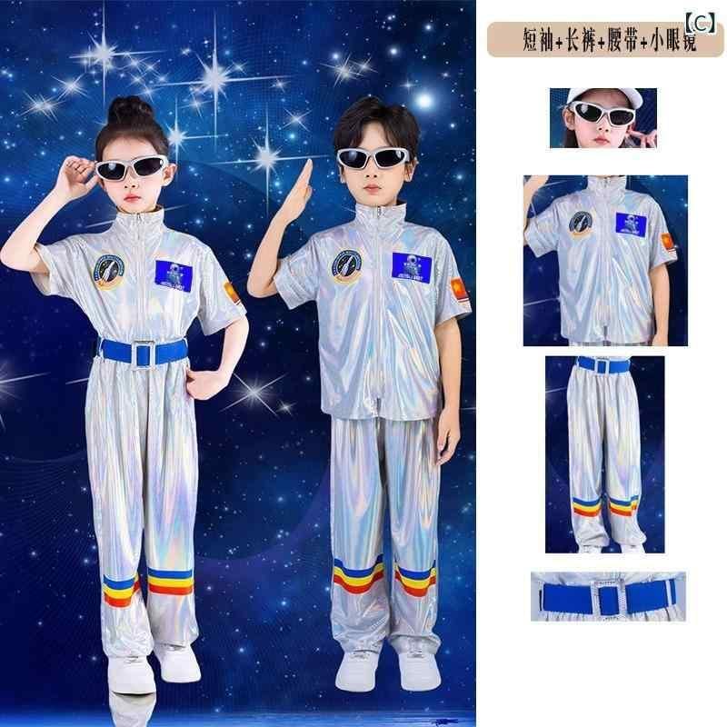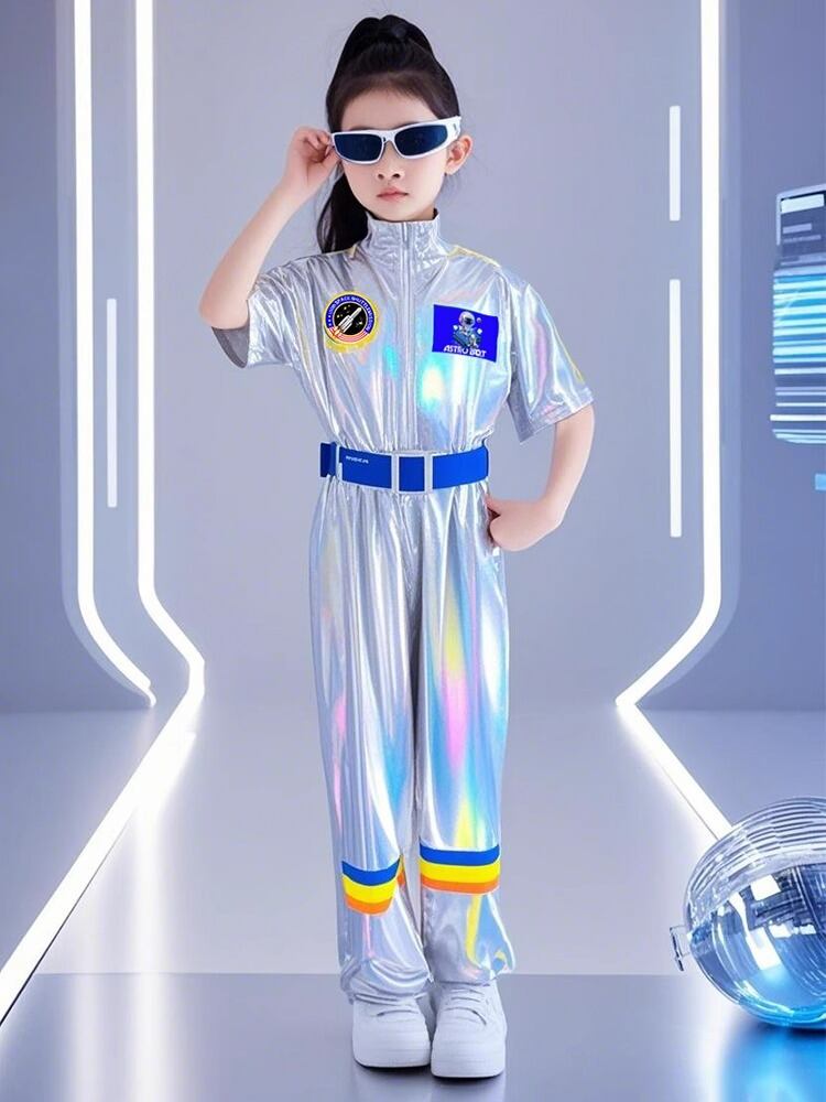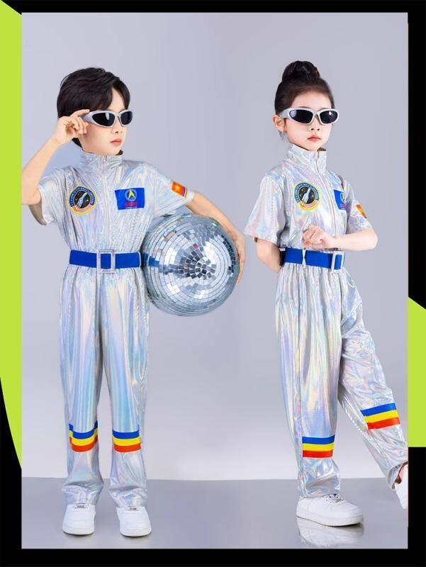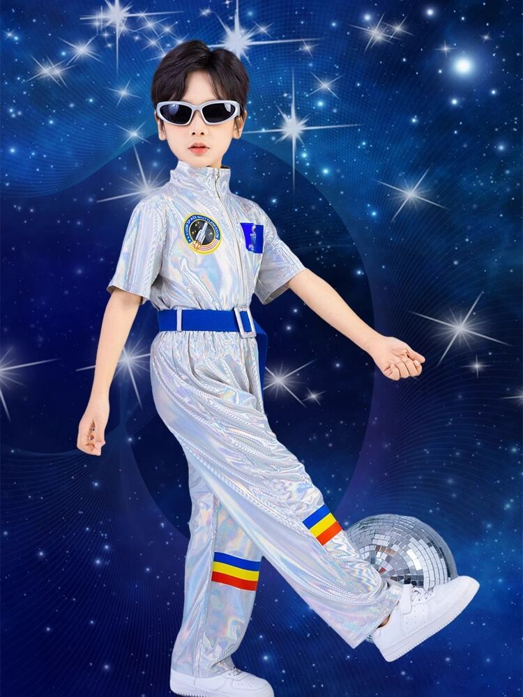 キッズ コスチューム 男女兼用 幼児 小学生 中学生 宇宙飛行士 ロボット ダンス衣装 スパンコール 発表会 舞台 イベント用 キラキラ 光沢感 シルバーカラー 近未来的デザイン 化学繊維製 ソフトタッチ素材