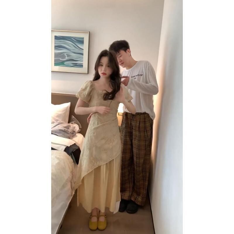 ワンピース レディース エレガント 新中式デザイン 高級感 フェイクレイヤード ウエストマーク 着痩せ効果 ハイウエスト 半袖 ロング丈 フレアスカート ラウンドネック ポリエステル素材 カジュアルスタイル
