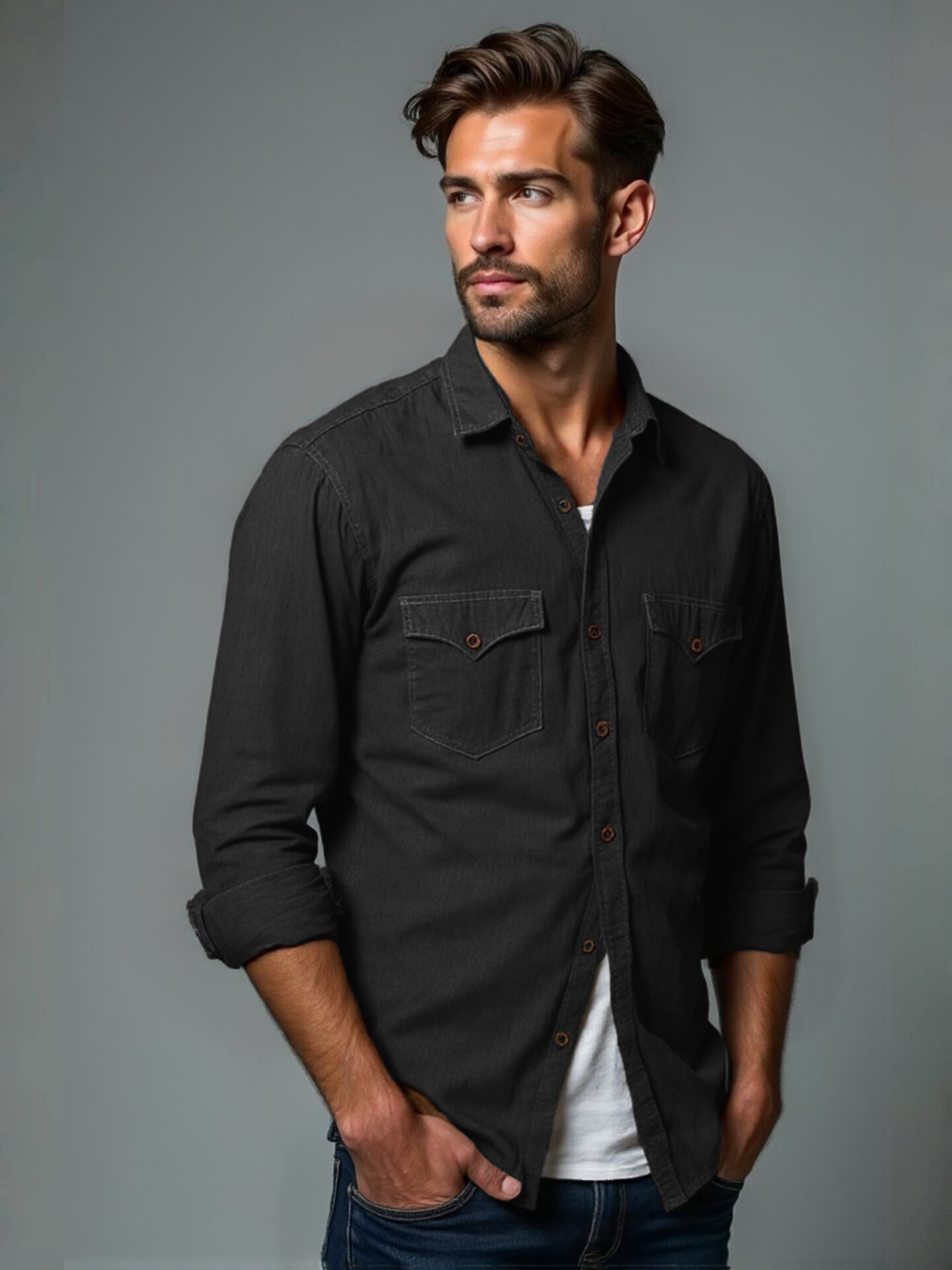 シャツ メンズ カジュアル 長袖 デニムシャツ ワークウェア アウトドア 普段使い レトロ ウォッシュ加工 スタンドカラー 綿混 ルーズフィット オーバーサイズ 無地 ブラック グレー ライトブルー カーキ