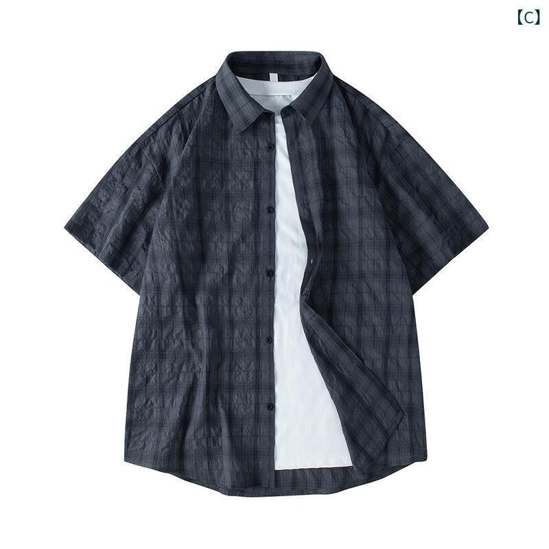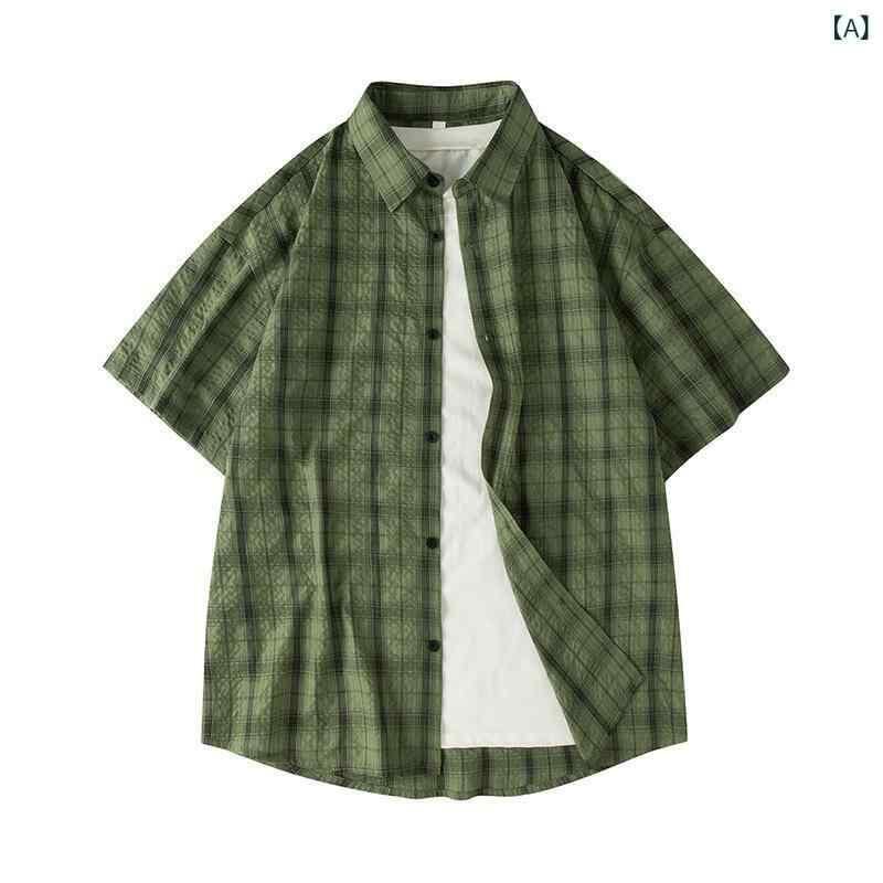 シャツ メンズ 男性用 半袖 先染め チェック柄 格子柄 ゆったり オーバーサイズ 薄手 軽量 通気性 襟付き 開襟 ポリエステル 上質 カジュアル 普段使い デイリーユース リラックスウェア 洗濯機洗い可 夏物 緑 青 灰 白 茶