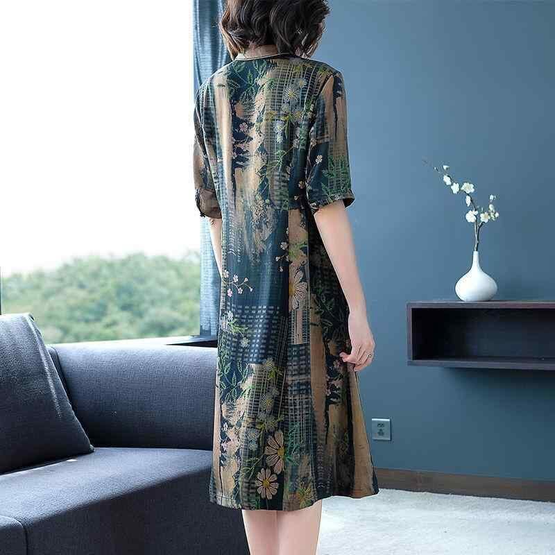 ワンピース レディース エレガント 高級感 体型カバー ゆったり 大きいサイズ Aライン 膝下丈 ミモレ丈 ヒップ 太ももカバー ポロ襟 五分袖 プリント 配色 ポリエステル レトロ フェミニン