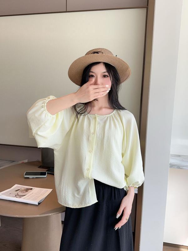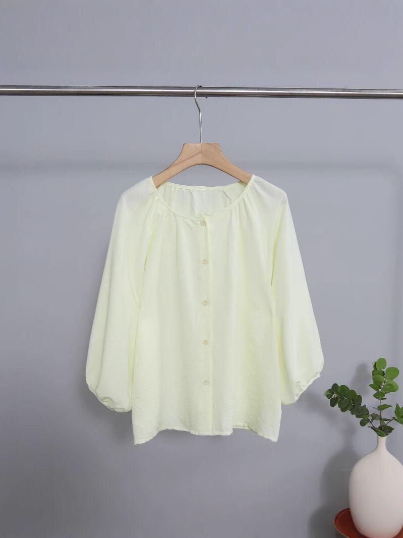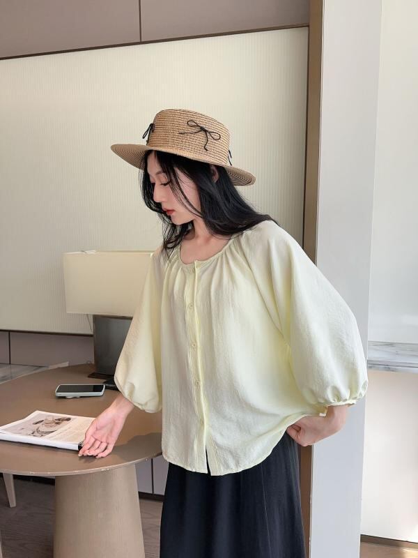 ・カテゴリ: ブラウス ・主な素材: ポリエステル95% ・袖丈: 七分袖 ・ネックライン: Uネック ・着丈: 普通 ・カラー展開: ベージュ、ピンク、ライトイエロー ・サイズ展開: L、XL ・スタイル: 甘め、清新風 ・柄: 無地 ・前立て: シングルブレスト