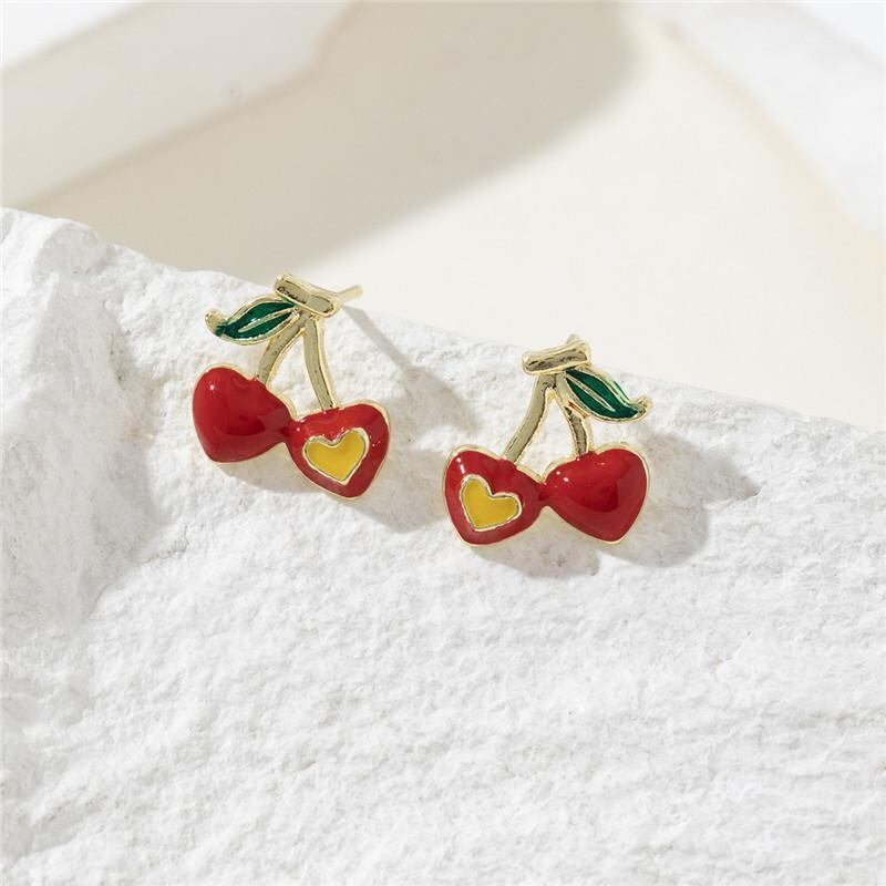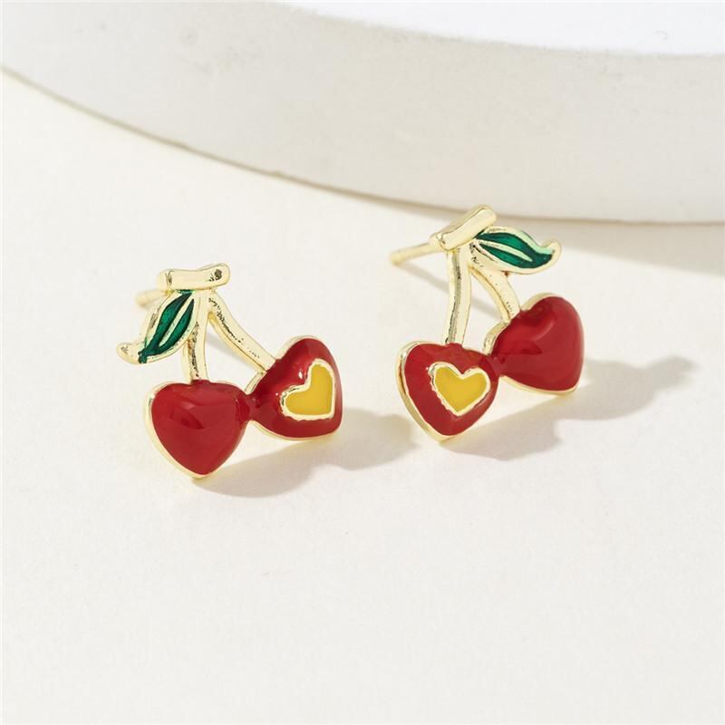 耳飾り レディース 女性用 シンプル 高級感 デザイン カラフル エナメル加工 サクランボ ハート フルーツモチーフ スタッド ドロップ ピアス イヤリング レッド かわいい 普段使い お出かけ 上品 アクセント