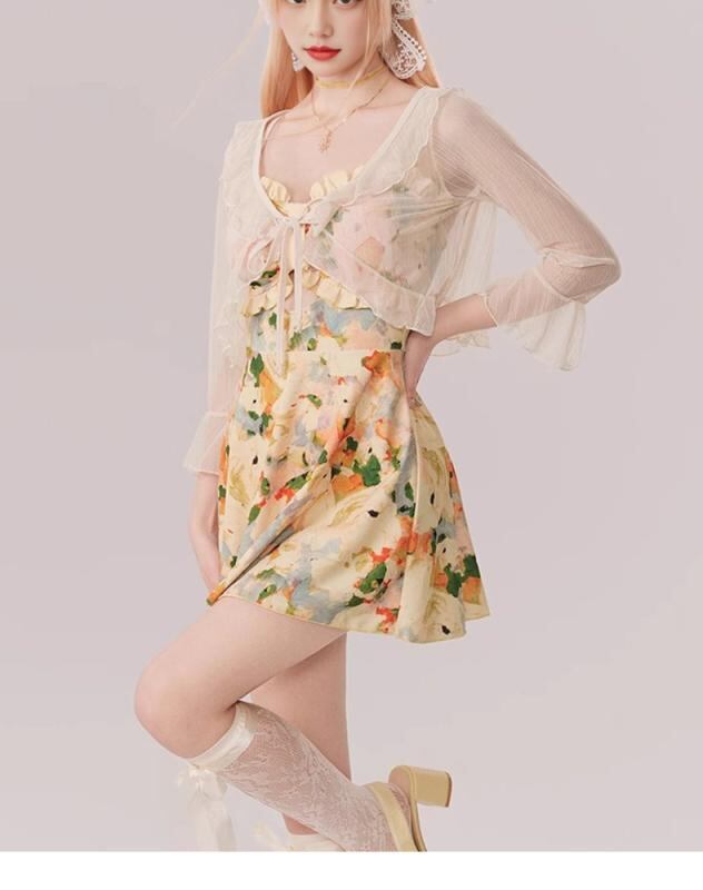 水着 レディース 女性用 セパレート 長袖 体型カバー 細見え効果 お腹カバー 小胸 バストアップ 日焼け対策 UVカット 速乾 露出控えめ 小花柄 胸パッド付き ノンワイヤー ショートパンツ イエロー おしゃれ スタイリッシュ