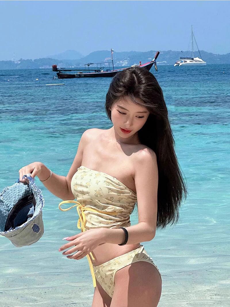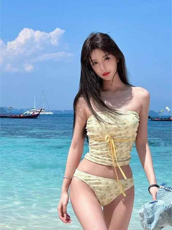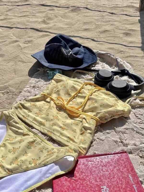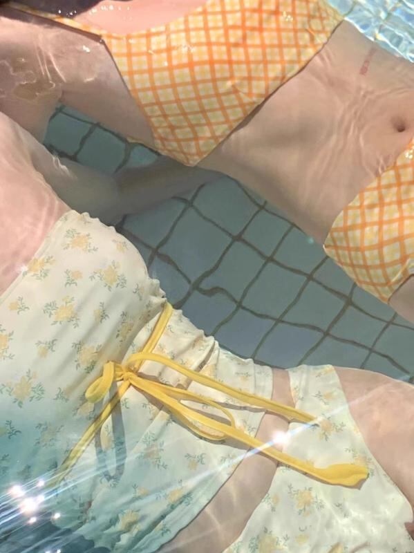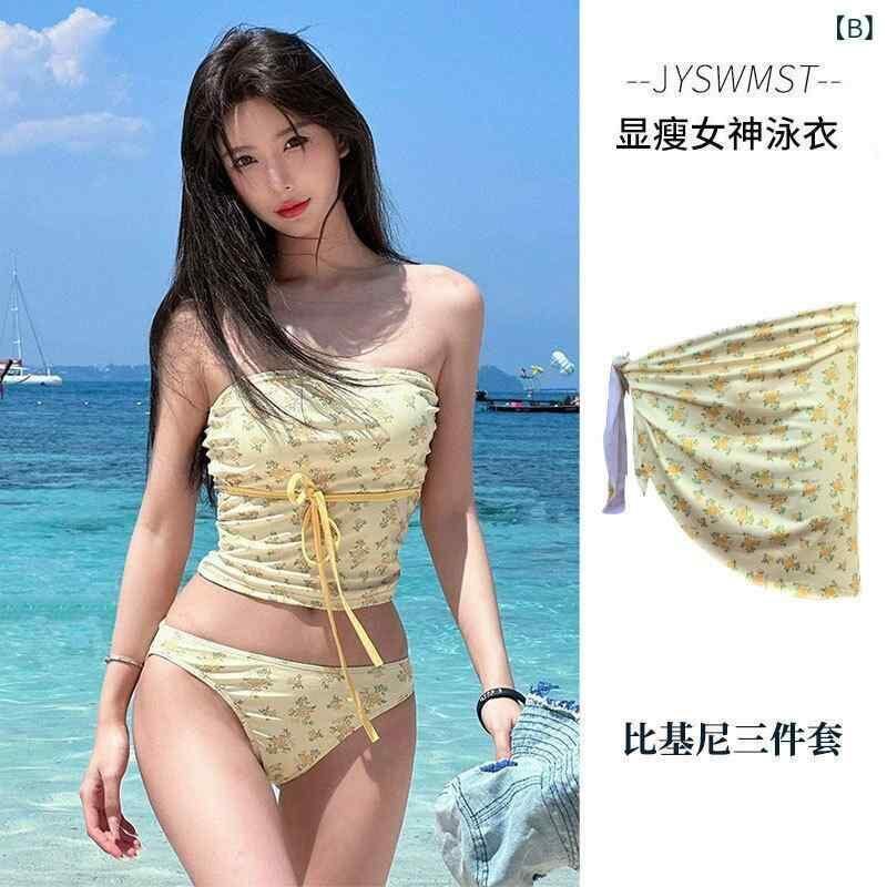 水着 レディース セパレート ビキニ スリーピース 小花柄 セクシー ラップスカート付き 胸パッド付き ノンワイヤー 再生繊維 ポリエステル リラックス カジュアル プール 海水浴 レジャー イエロー系