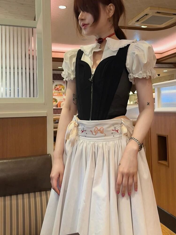 ワンピース レディース 小柄 Aライン フレアスカート オフショルダー 2way ノースリーブ ミディ丈 子羊刺繍 リボン ホワイト カジュアル 韓国ファッション