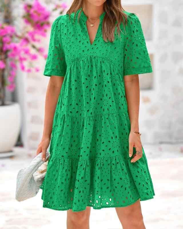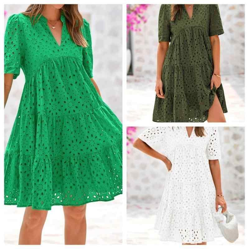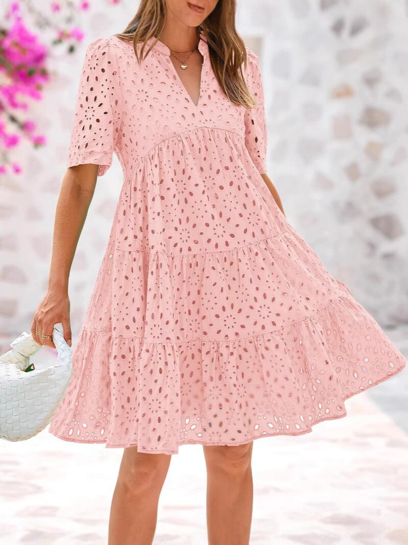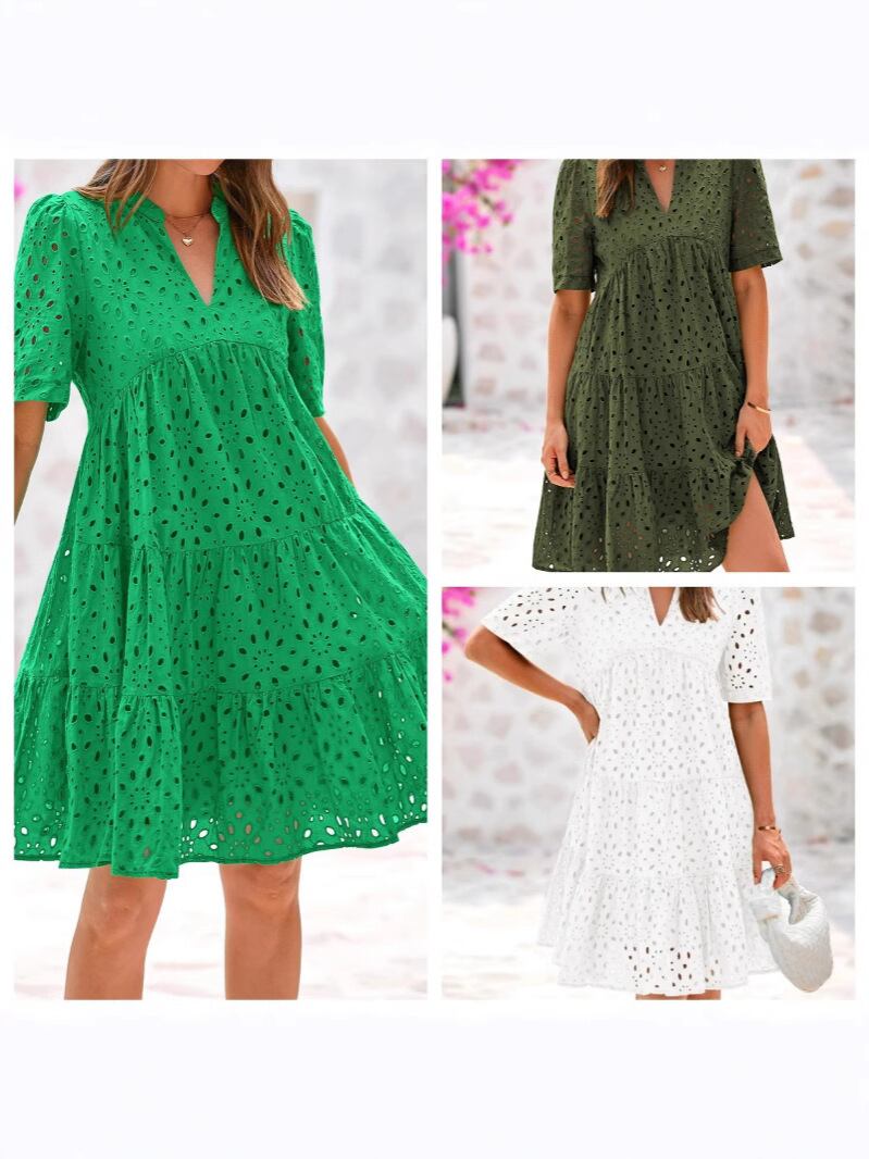 ワンピース レディース Vネック Aライン 透かし編み レース 刺繍 半袖 上品 フレンチスタイル 綿素材 無地 ミディ丈 ハイウエスト ウエストゴム 切り替えデザイン オフィス リゾート エレガント ホワイト ブラック ピンク ネイビー