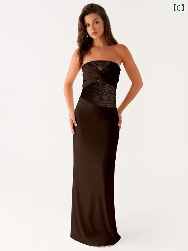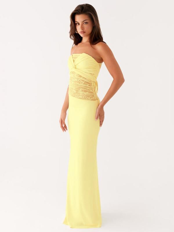 ワンピース レディース 欧米風 ノースリーブ オフショルダー ツイスト リボンタイ 無地 レース切替 ロング丈 Aライン ポリエステル スパンデックス ストリート カジュアル ライトイエロー ブラック ブラウン