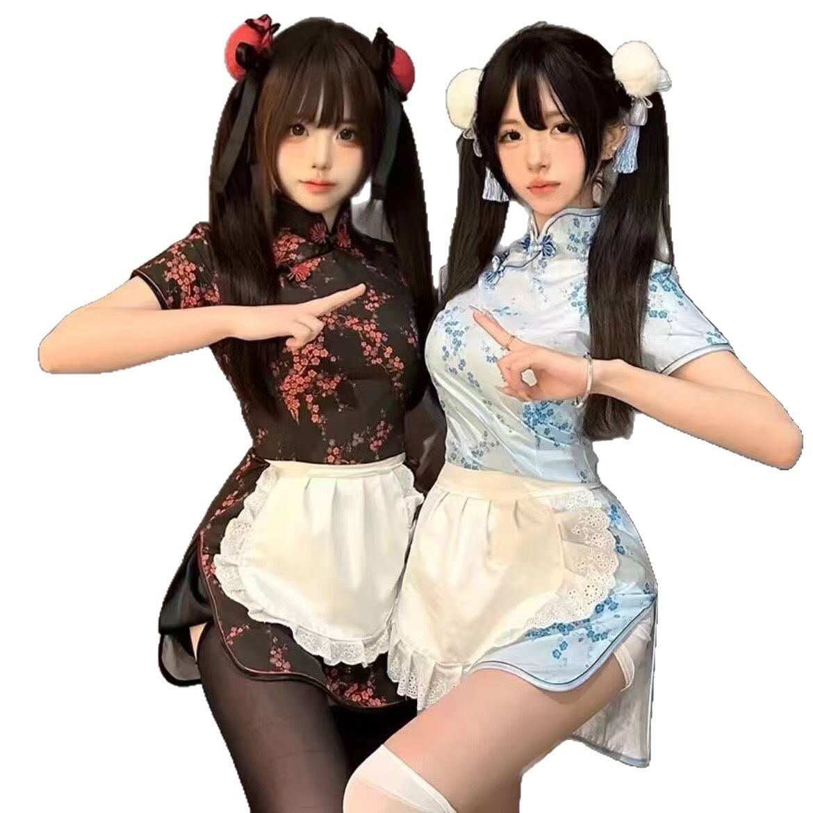 コスプレ衣装 レディース 中華風 ロリータ メイド服 小厨娘風 チャイナドレス ワンピース エプロン セット ブラック ブルー ピンク ポリエステル素材 清楚系 スイート ゲームイベント用