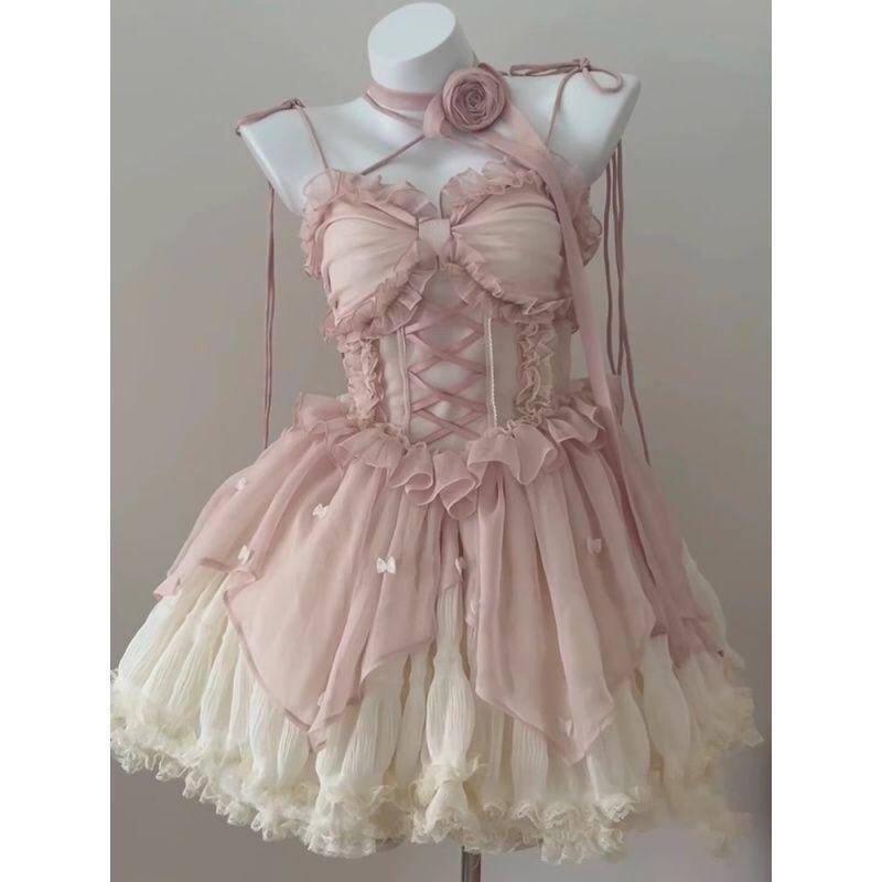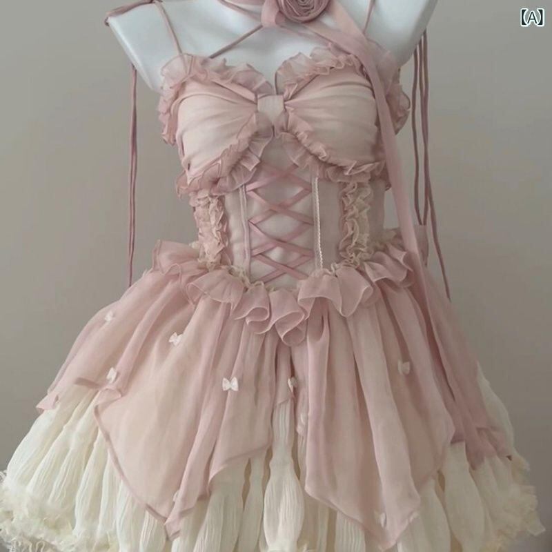 ワンピース レディース ピンク バレエ風 ロリータ プリンセスドレス ふわふわ ウェディング 舞台 発表会 パーティー イベント エレガント キャミソール ノースリーブ ミディ丈 ドレス