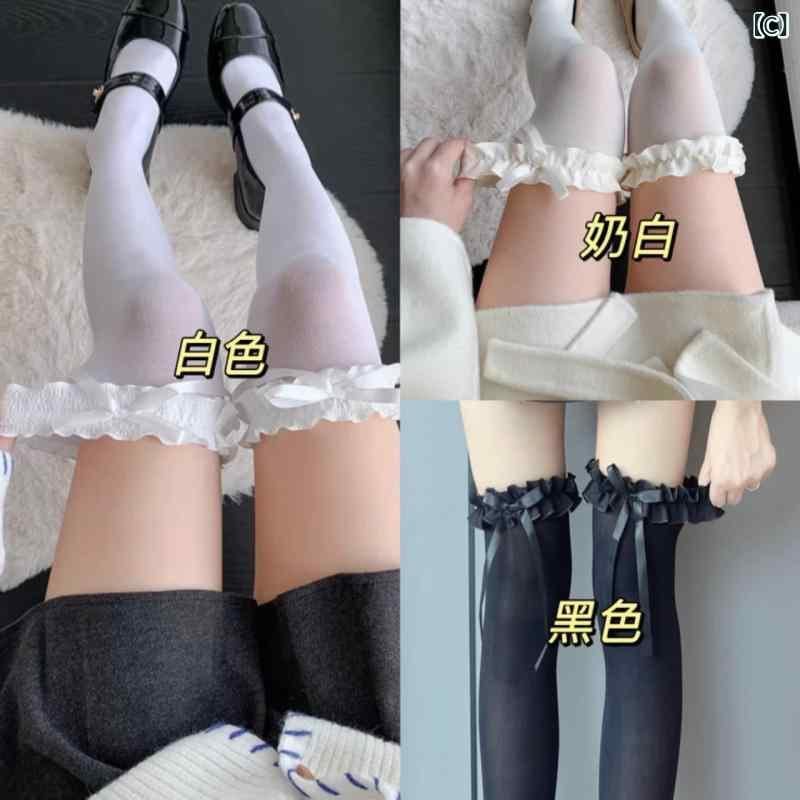 ニーハイソックス レディース ロリータ風 スクール風 レース フリル リボン かわいい ナイロン 吸汗性 オフホワイト ブラック ホワイト