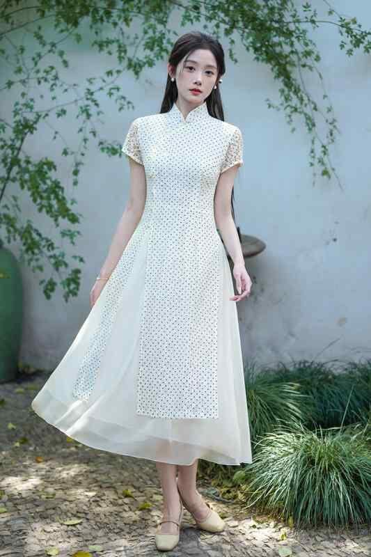 チャイナドレス レディース 改良型 アオザイ風 ロング丈 レース素材 ポリエステル ウエストマーク フレアスカート ハイネック 七分袖 スリット入り 普段使い 中国風 エレガント 上品