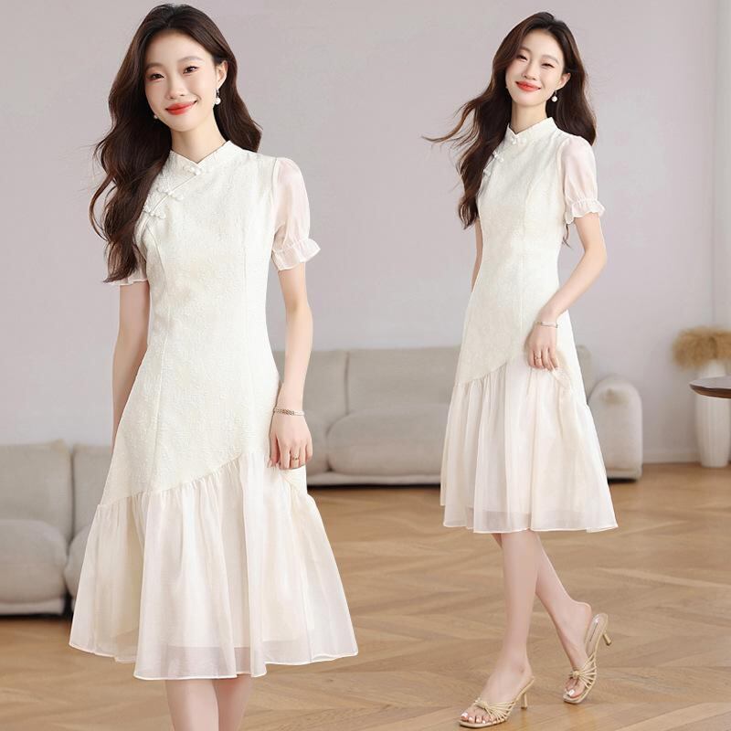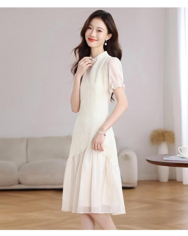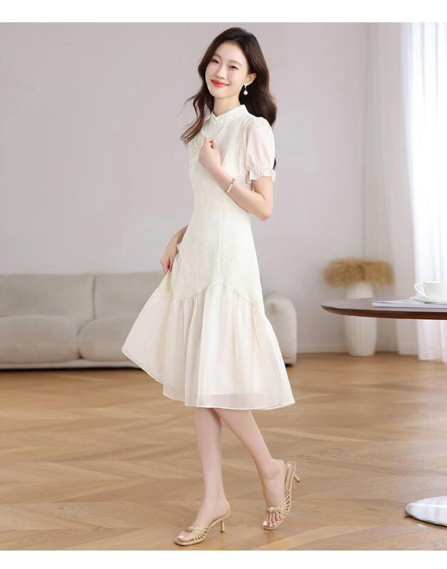 ワンピース レディース 新中華風 チャイナドレス 改良 レトロ パッチワーク 異素材切り替え エレガント 上品 デザイン性 細見え 着痩せ効果 スタンドカラー 半袖 パフスリーブ ハイウエスト ミディ丈 フリル ジャガード織り アプリコット ベージュ系
