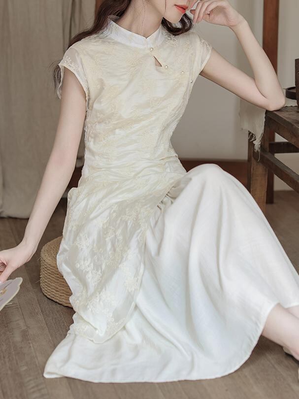 ワンピース レディース ベージュ 改良チャイナ風 ロング丈 Aライン 半袖 ハイウエスト ラウンドネック 綿混紡 エレガント 上品 通勤 オフィスカジュアル