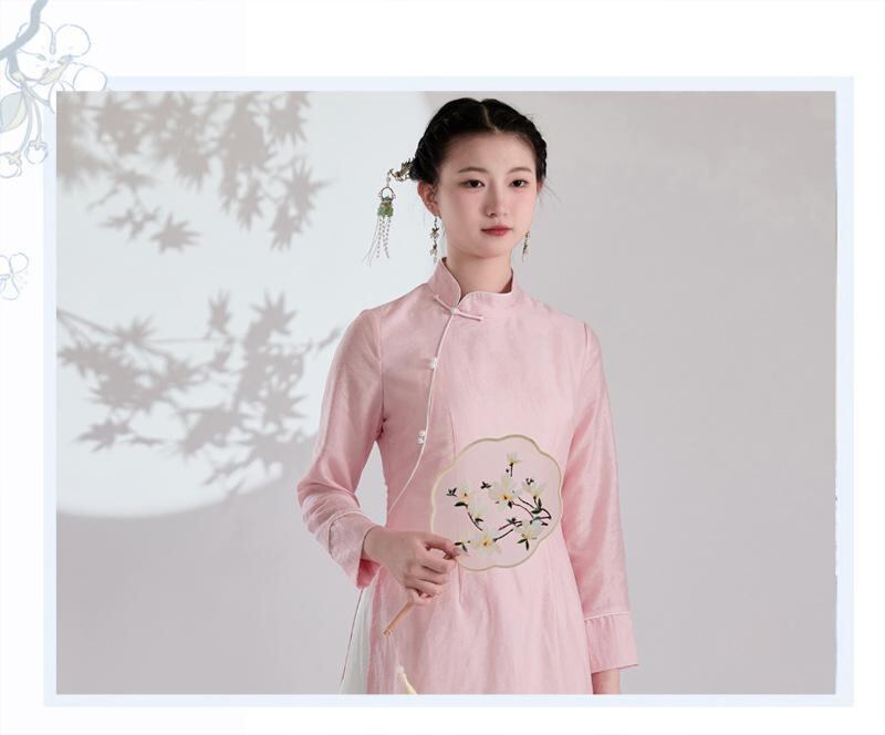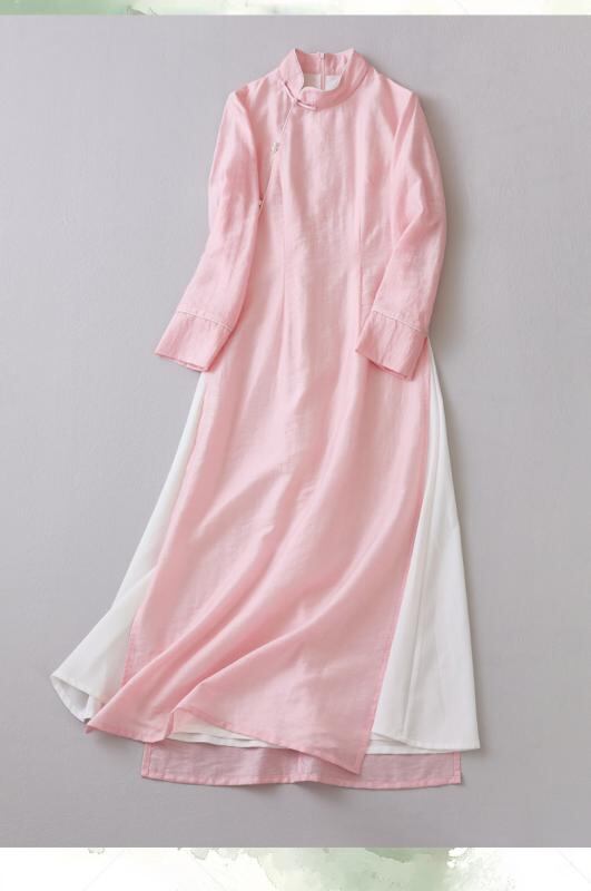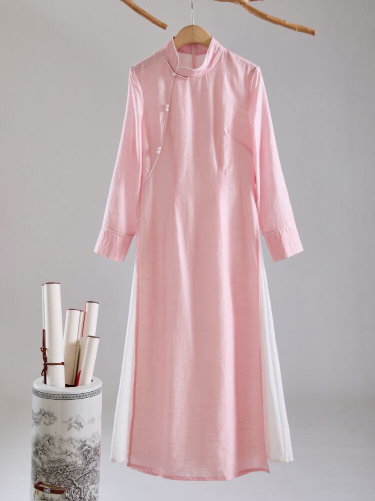 ワンピース レディース 禅スタイル 茶芸師 ワークウェア 日常使い 改良型 チャイナ風 テンセル素材 ミディ丈 Aライン スタンドカラー 七分袖 ピンク パイピング パールボタン エレガント レトロ